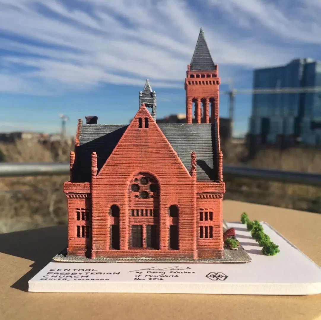 🇺🇸 Welcome to Denver, the Mile High City! MiniWorld3D's founder Dany Sánchez lived in Denver for some time and created several models representing landmarks of the city. The Central Presbyterian Church of Denver, Colorado is a historic church located downtown. It was built in 1891 and designed in the Richardsonian Romanesque style (from Wikipedia). MiniWorld3D is happy to bring this historical model to life as a homage to all the people of Denver. Please give credit, it's all about spreading culture! If you like our work, please consider joining our F3D.com Club or our Patreon! patreon.com/MiniWorld3D Find all our profiles, YouTube channel & social media on: linktr.ee/miniworld3d Follow us on IG! instagram.com/miniworld3d MiniWorld 3D is a collective of 55+ artists creating the best library of 3D printable models of landmarks of the world! Print photos by Dany Sánchez in white PLA, hand-painted with acrylics. Two different scales are shown in the main photo. ---------------------- #### Printing Tips Easy print No supports required. Minimal or no infill are possible. No rafts or brims needed. Use slow speeds, especially in outer perimeter, such as 20 mm/s