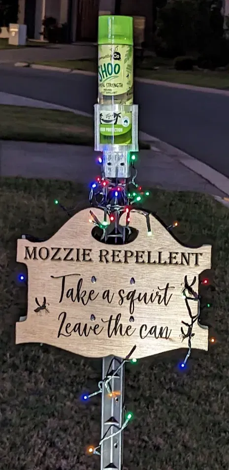 Muốn gắn một lon thuốc xịt muỗi phía trước khu trưng bày đèn Giáng sinh của tui để mọi người xài. Đây là giải pháp của tui.