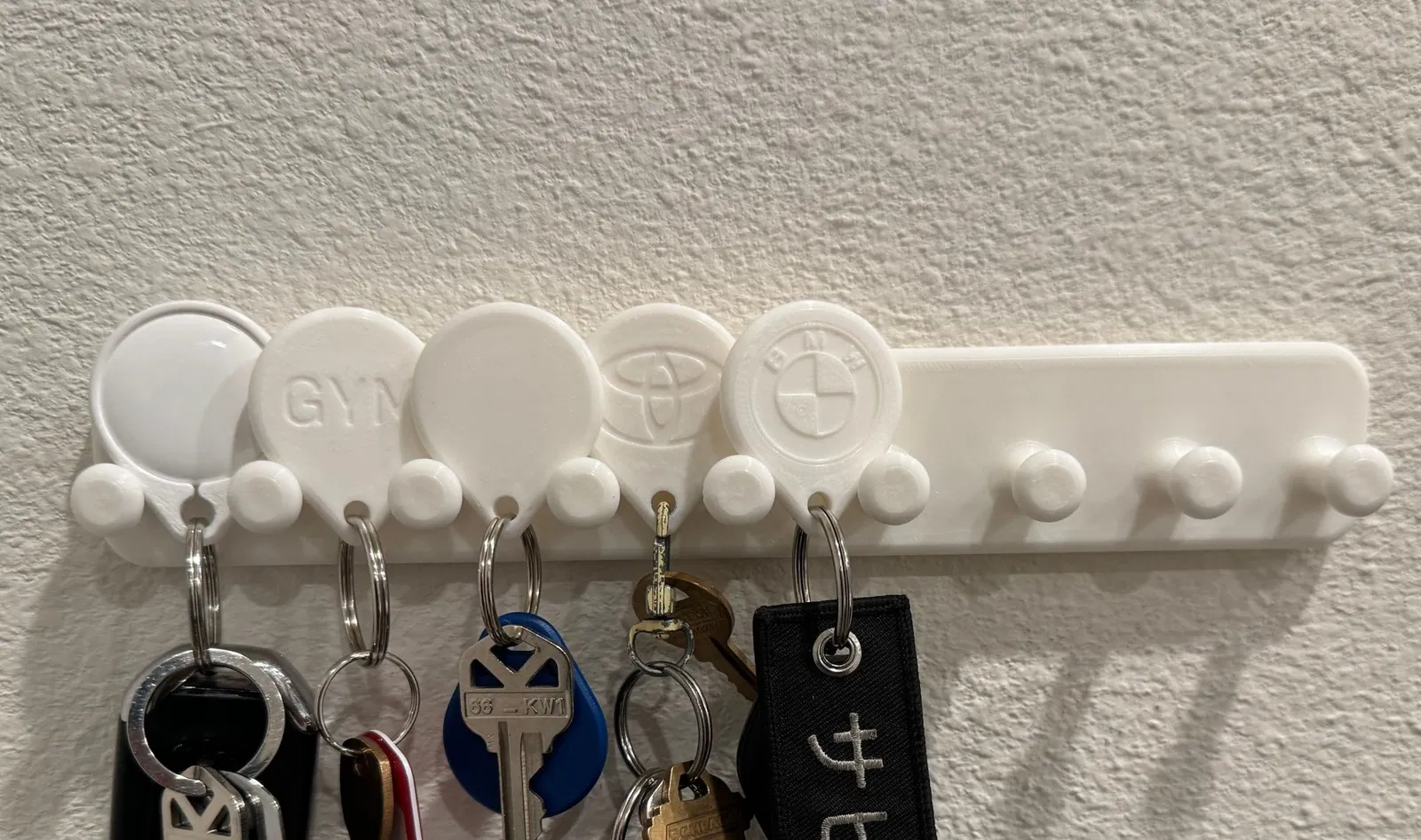 Móc treo chìa khóa gắn tường 8 chìa, có cả móc chìa khóa logo xe hơi, móc khóa phòng gym và file trống để bạn tùy chỉnh. Có file STEP kèm theo, in không cần hỗ trợ. Thiết kế để dùng chung với holder Airtag.