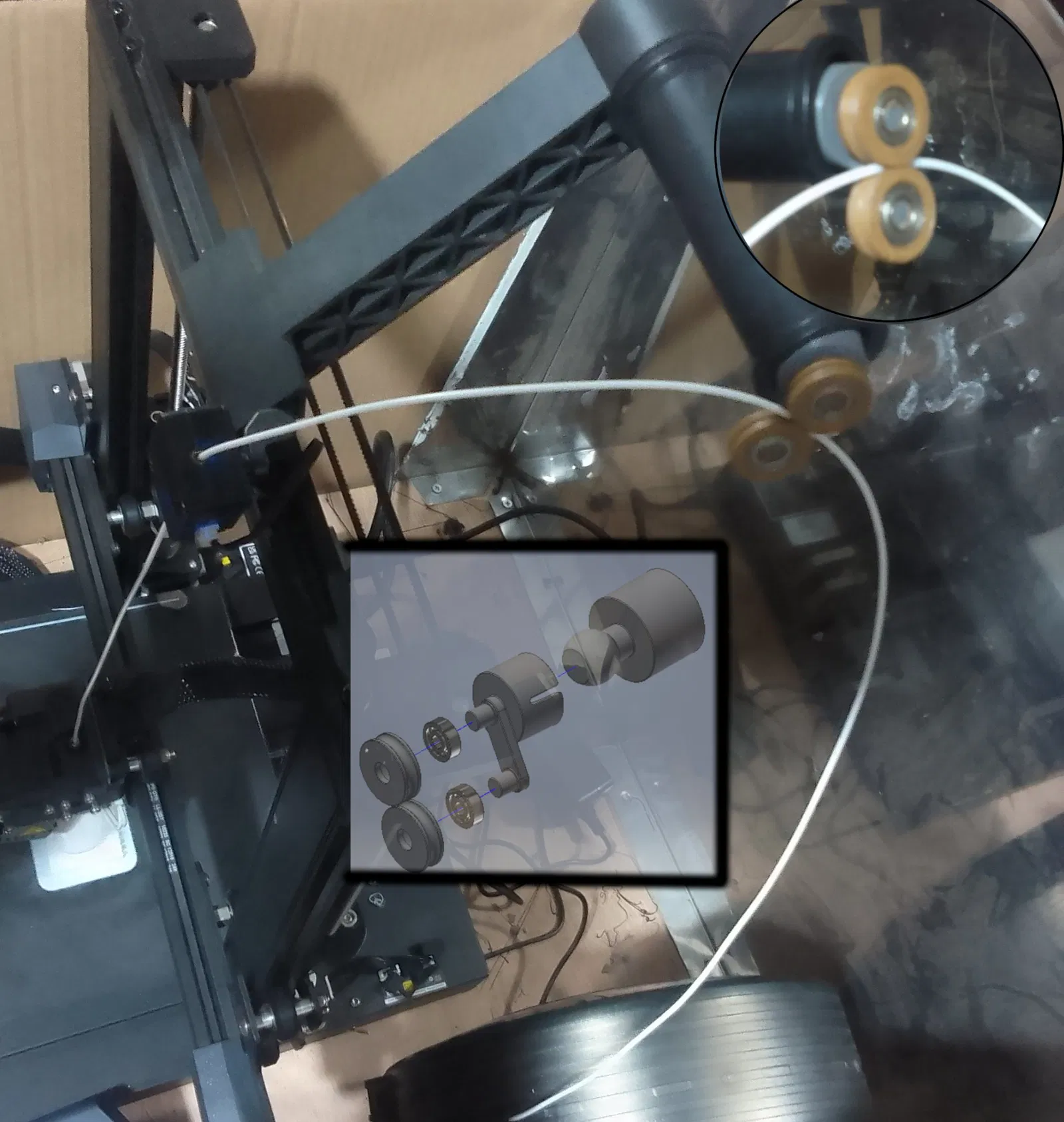 con el fin de facilitar la alimentación del filamento desde la cámara de calefacción he diseñado esta guía con rodamientos y una rotula, básicamente se inserta en el soporte del la bobina que viene en la ENDER3S1, la rotula tiene un ajuste libre forzado, para posicionar los rodillo de manera que el filamento tenga una transición suave desde el calefactor hasta el cabezal de impresión, y no se mueva mientras trabaja…