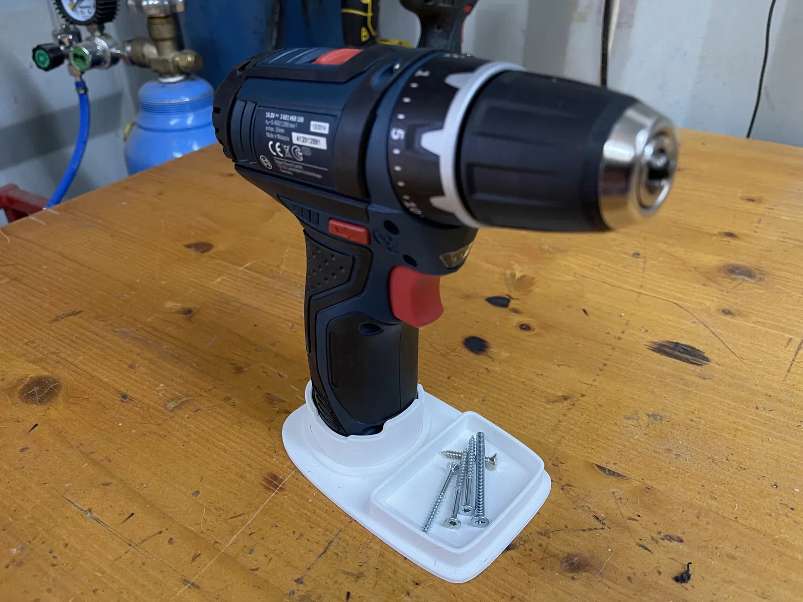 Có rất nhiều người giữ tường cho máy khoan và tuốc nơ vít Bosch 12V nhưng tôi muốn có chúng đứng trên bàn làm việc của tôi