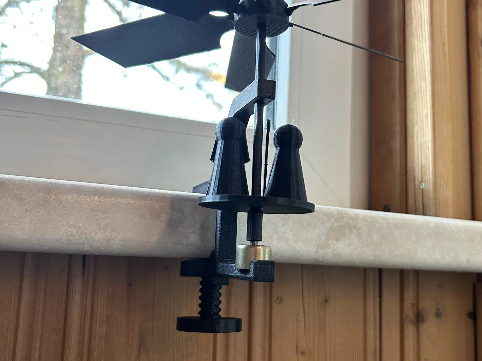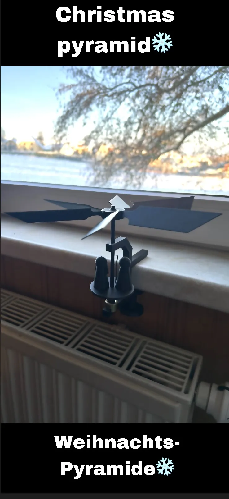 Christams pyramid for window frame. You can clamp the pyramid on any window frame with the ajustable screw. If you dont have a heating under the pyramide just use some candles :)