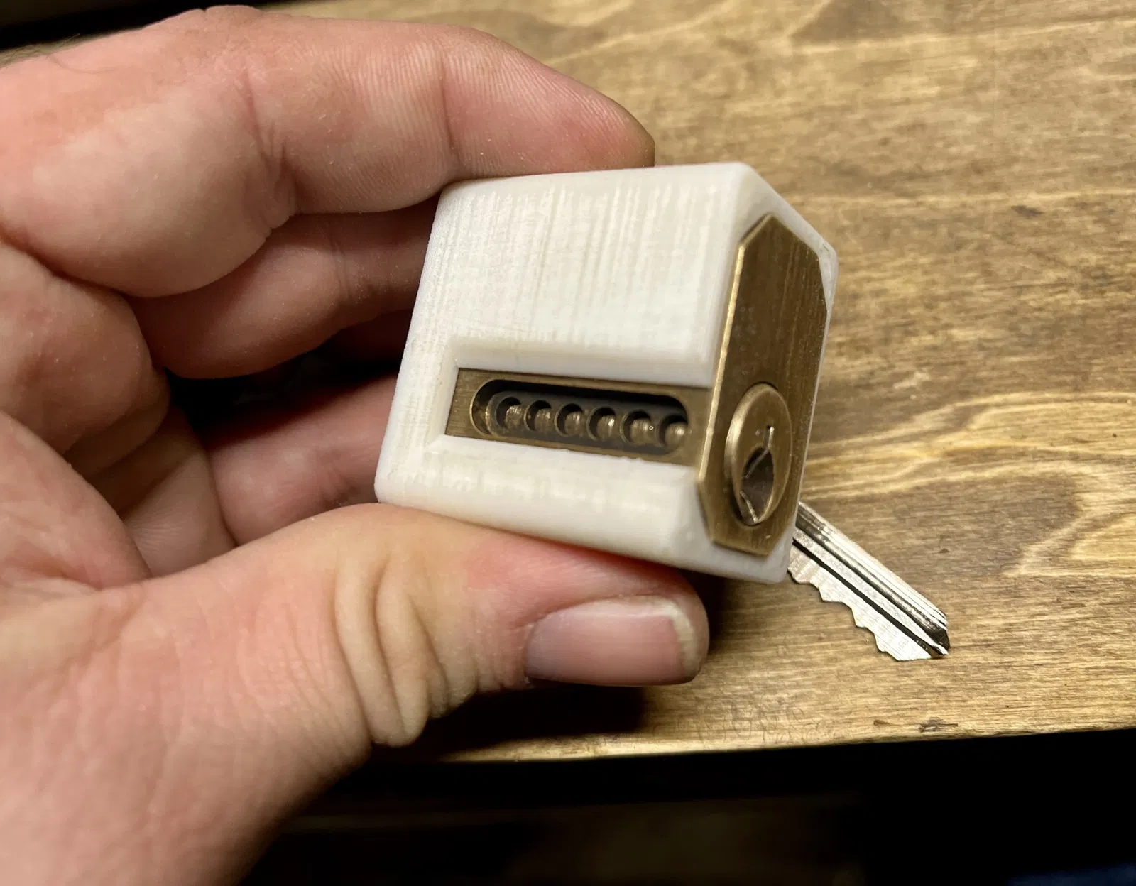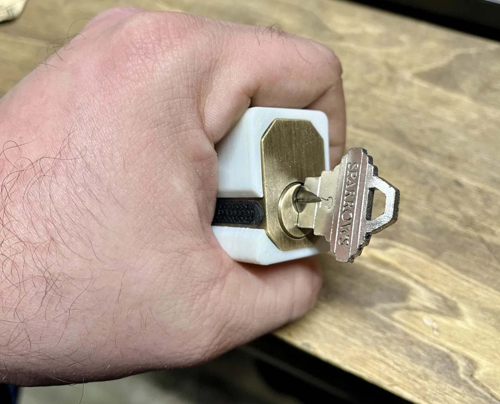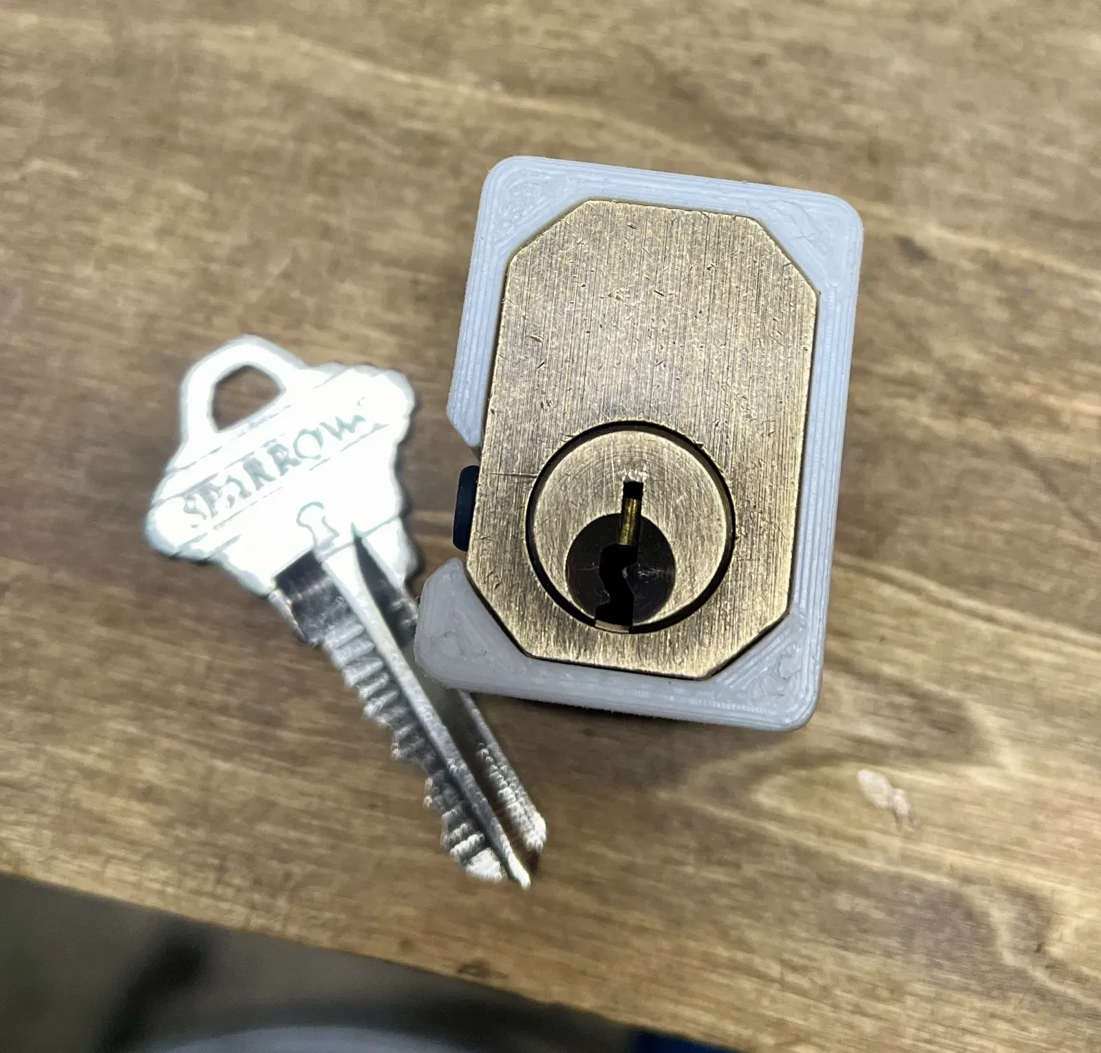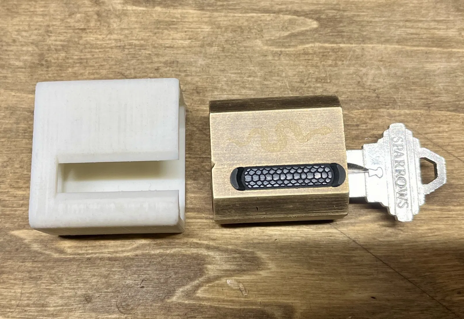 Đây là một cái đế giữ cho ổ khóa tập luyện Sparrows Sidewinder. Cái đế này cho phép bạn truy cập vào các lỗ nạp bên cạnh, và giúp bạn giữ nắp cao su ở đúng vị trí.