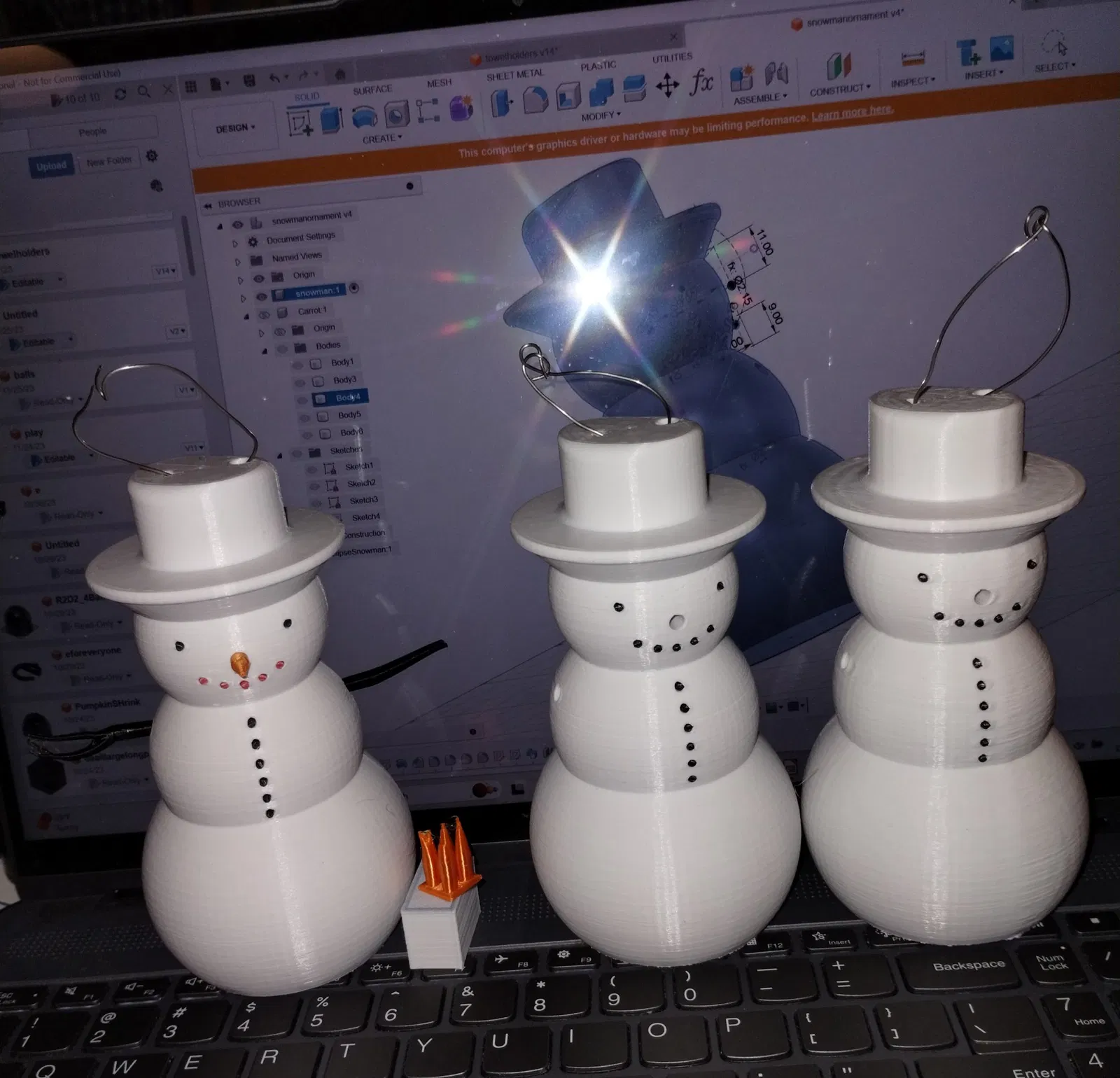 Mô hình Người Tuyết/Ông Già Tuyết/Tuyết-bất-cứ-thứ-gì-bạn-muốn có thể treo hoặc để bàn, cao 133mm. Dễ dàng cá nhân hóa với tay và cà rốt có thể tháo rời, nút và mắt bằng filament. In bằng PLA, không cần supports, raft hay brim.