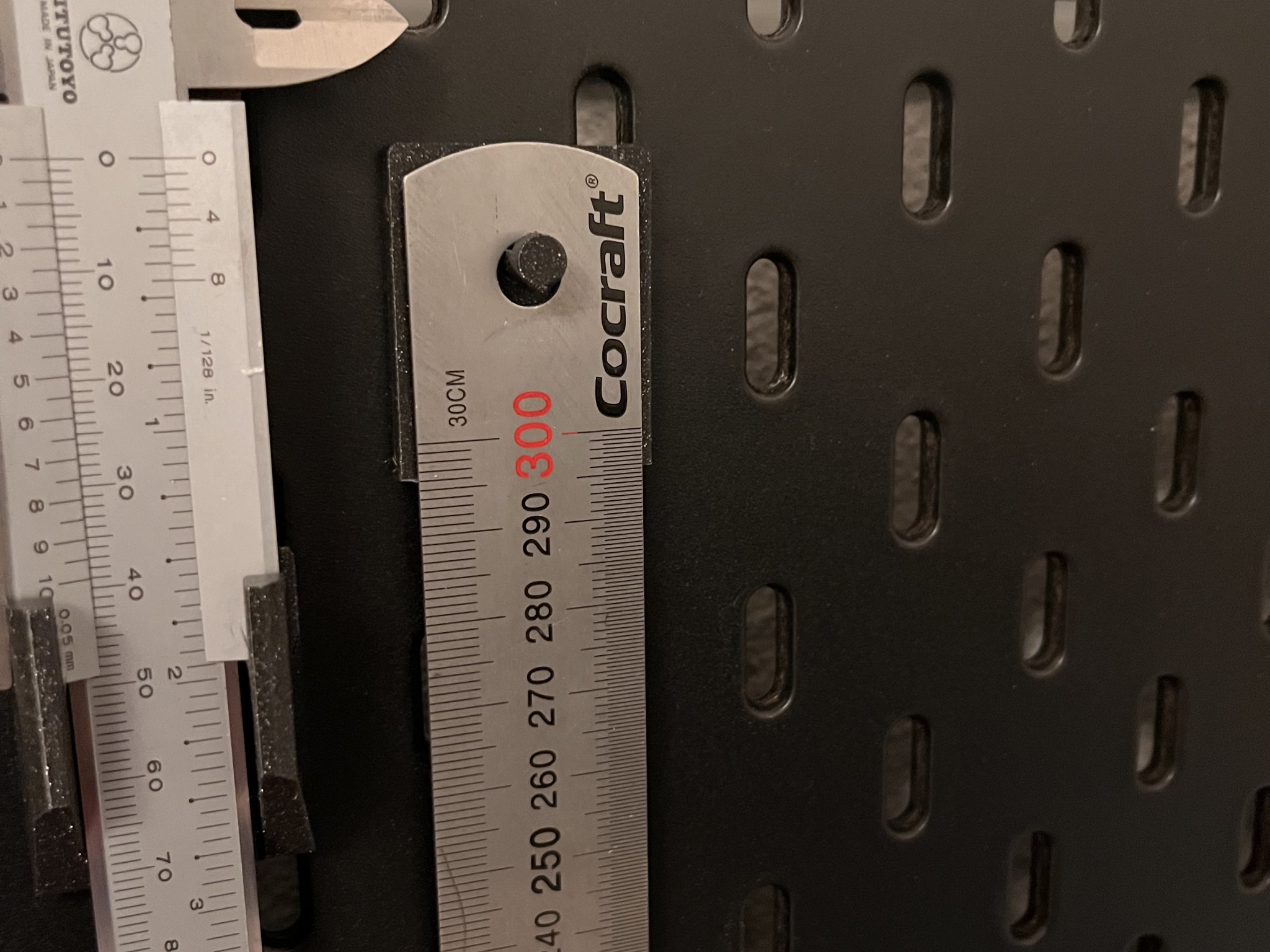 Tấm đế kèm chốt treo thước dây hoặc các vật dụng khác vừa với chốt 5.5mm. Mô hình được làm dựa trên các mẫu có sẵn, tối ưu hóa khả năng kết nối với pegboard Skadis. In bằng PLA với brim và support cho kết quả tốt.
