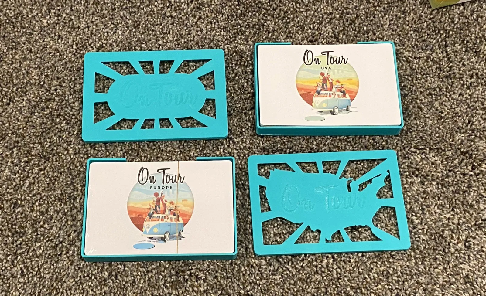 Bộ hộp và nắp đựng card cho board game On Tour by All Play. Có nhiều thiết kế khác nhau, bao gồm cả hình bản đồ Mỹ và nắp trơn. Phù hợp để sắp xếp và bảo quản các lá bài trong game.