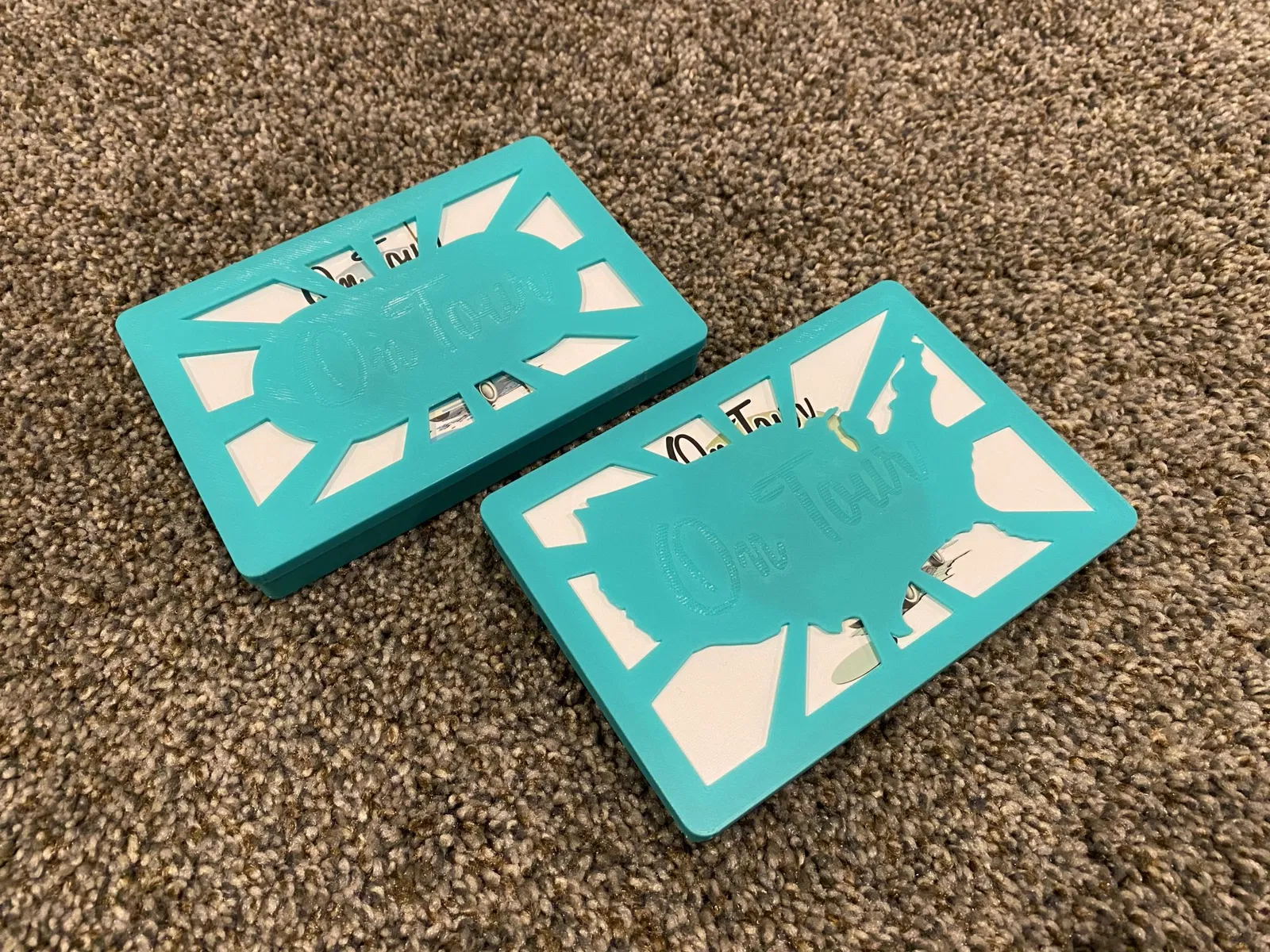 Đây là một bộ hộp và nắp đơn giản cho bộ board game On Tour. Một cái được thiết kế với đường viền của Mỹ, và cái còn lại có thiết kế đơn giản. (Xin lỗi Châu Âu, tui đã cố gắng nhưng hình dạng không phù hợp.) Ngoài ra còn có tùy chọn nắp trơn. In 2 hộp và 2 nắp.