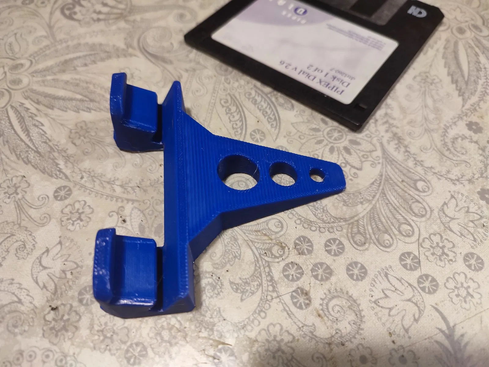 Tái chế đĩa mềm 3.5 inch thành đế điện thoại độc đáo, có thêm chi tiết boot và đuôi. Dễ in, không cần support, phù hợp với nhiều loại điện thoại.