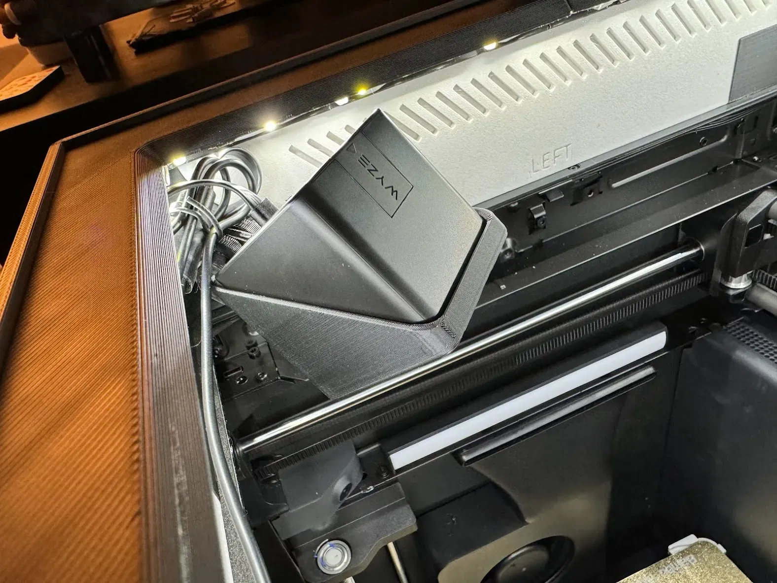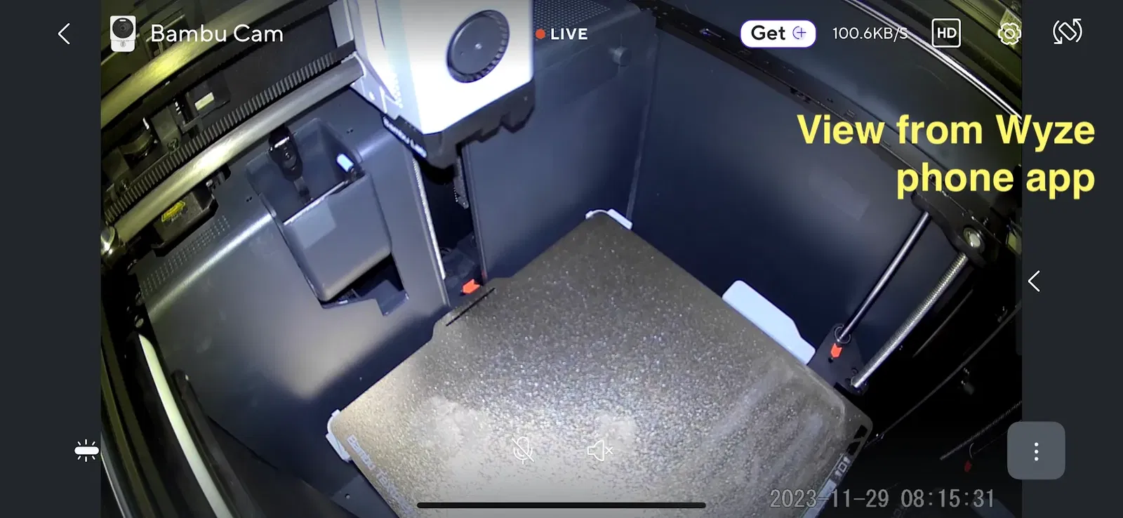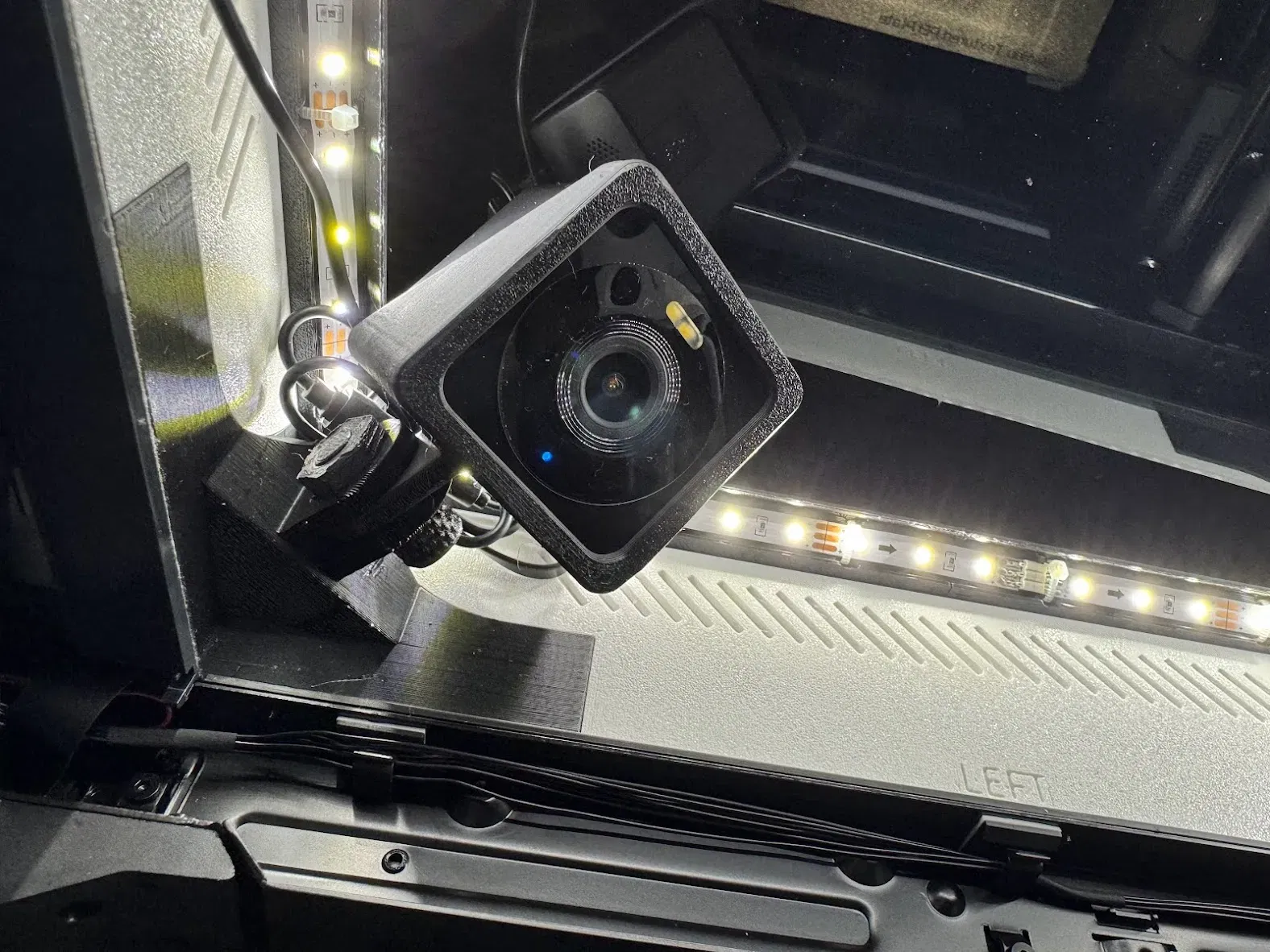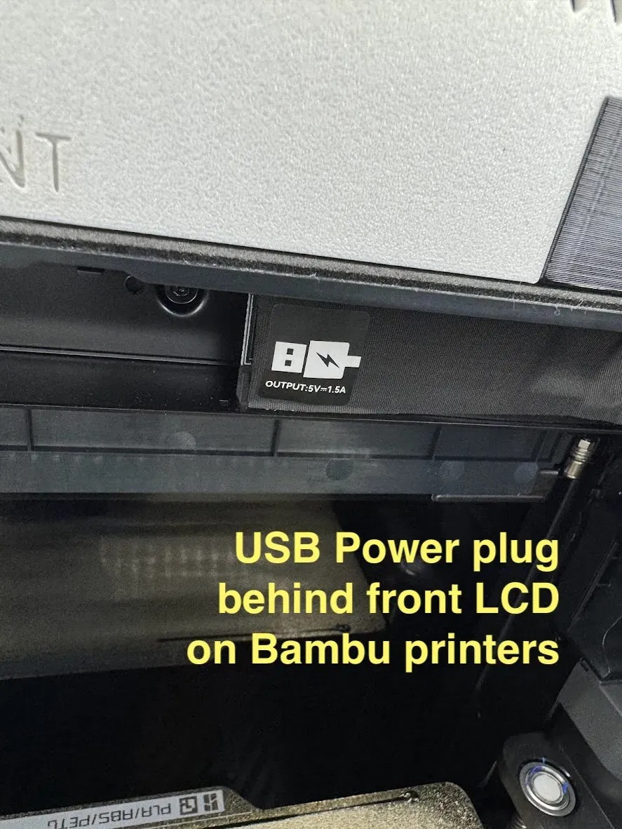 I've included a sample photo of how the view from the camera's mounting look like from within my Bambu P1S. I was also pleasantly surprised to find that the Bambu P1S/P1P has a USB power port right behind the LCD screen. Rated for 5V 1.5A, it can comfortably power the Wyze Cam OG without requiring external cable running into the printer.