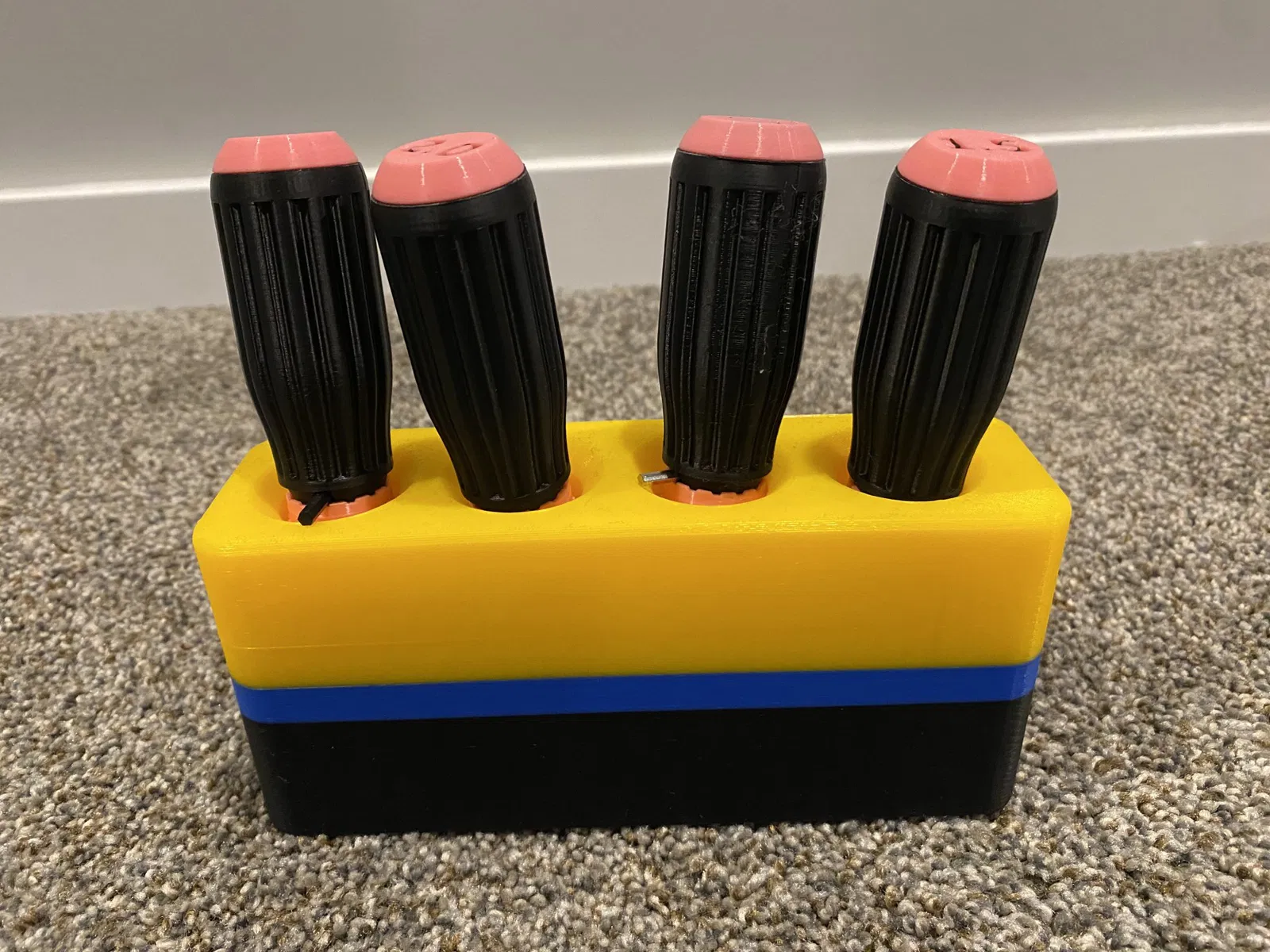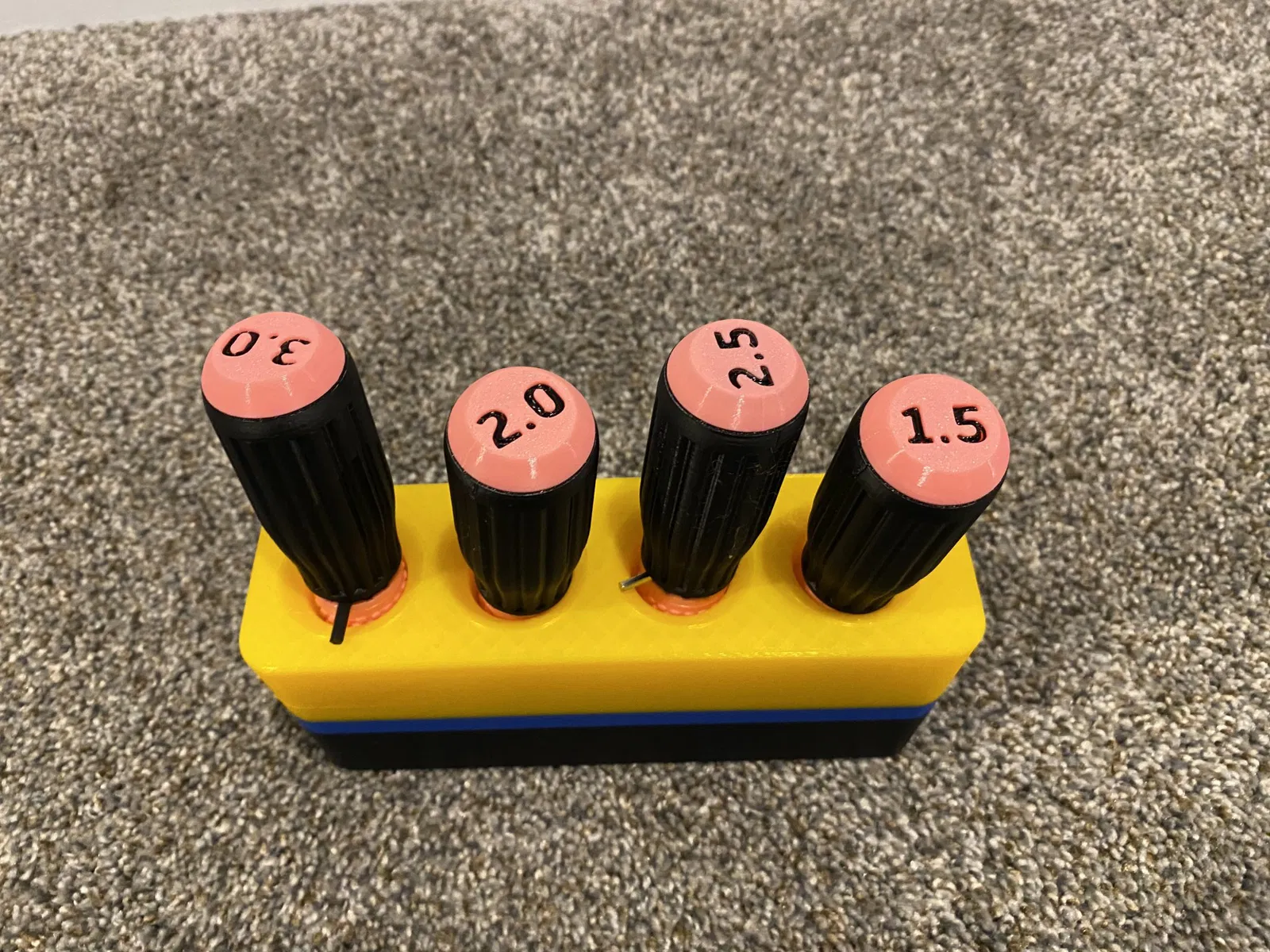 I made this simple organizer to hold my 4 most used sizes of the great Allen Key Driver set by OlleMark. Great use for some leftover filament colors. There are two designs. One uses a little less filament.