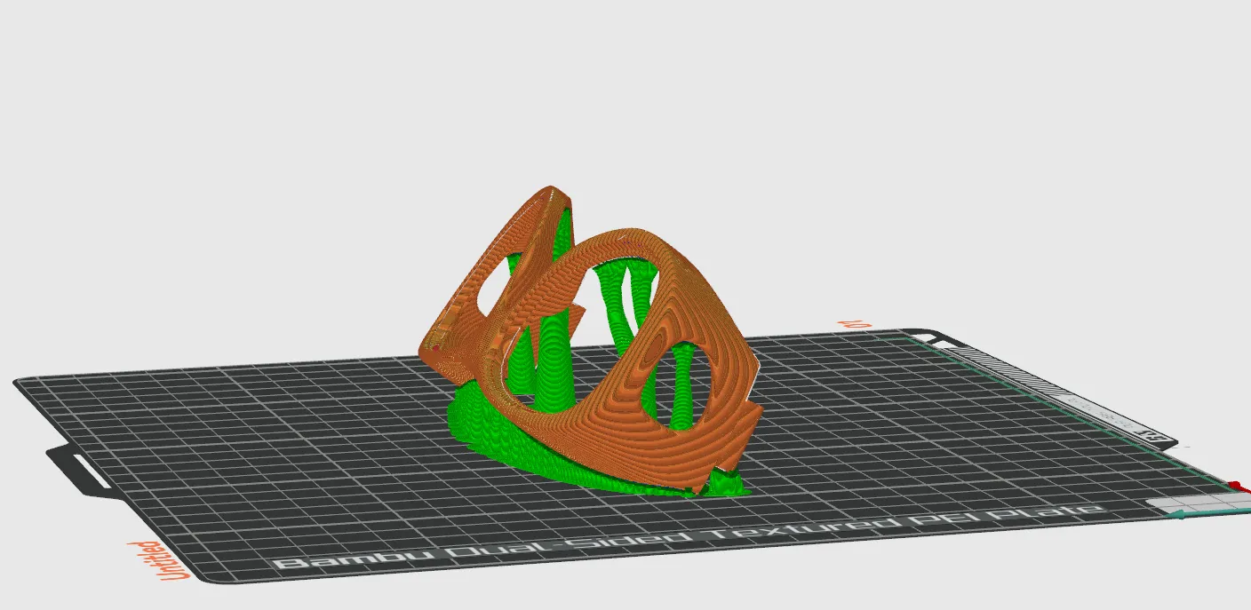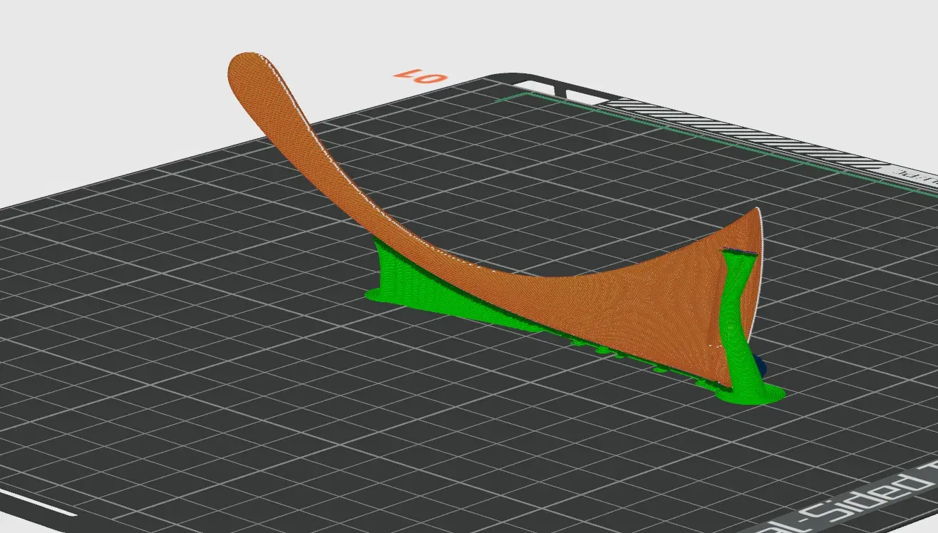 Tôi đã in phần thân chính của khung với bề mặt trên úp xuống, nghiêng đủ để không cần hỗ trợ ở bề mặt trên. Tôi đã sử dụng hỗ trợ cây trong Orca Slicer với tùy chọn chỉ hỗ trợ trên bàn in. Bạn có thể muốn đảm bảo có thêm hỗ trợ dọc theo phần sẽ là cạnh dưới của lỗ khoét tròng kính.