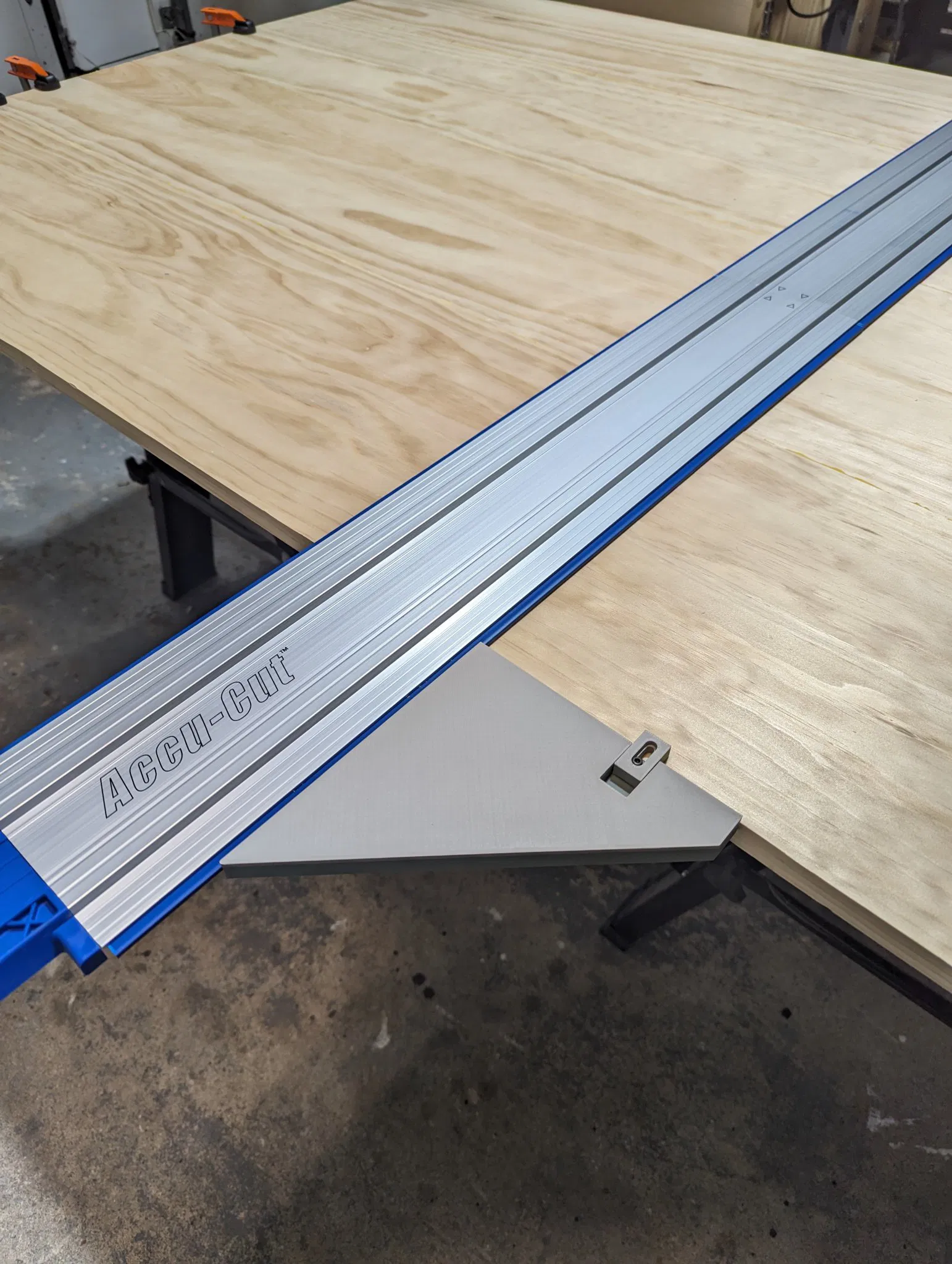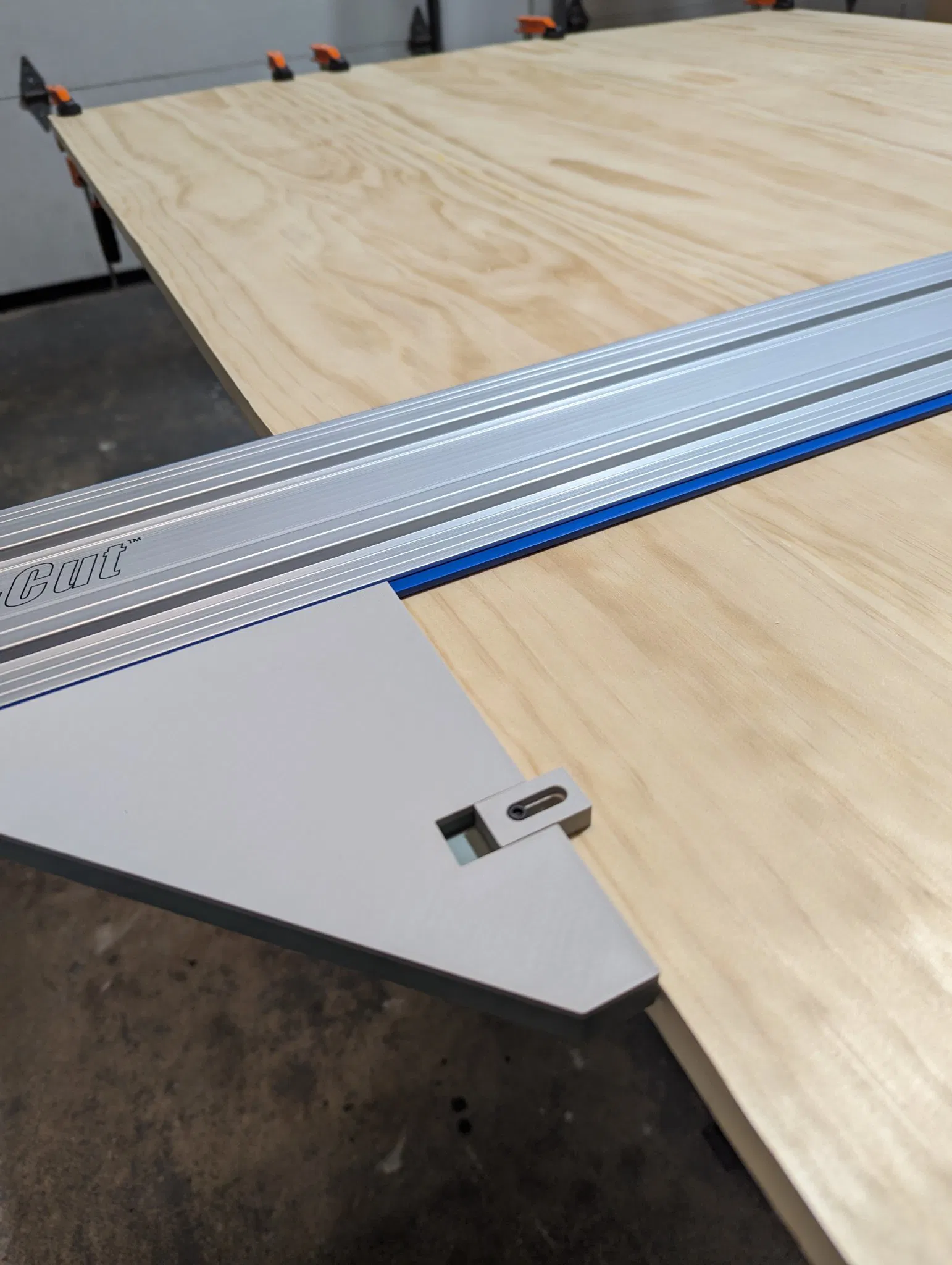 Cái ê-tô góc vuông này gắn thẳng vô rãnh T dưới thanh ray Kreg Accu-Cut luôn. Có thêm cục chặn điều chỉnh được phía trên để khỏi bị lật. Dùng ê-tô Kreg Tool KMA7520 Track Clamps, ốc m3, đai ốc và long đền để gắn.