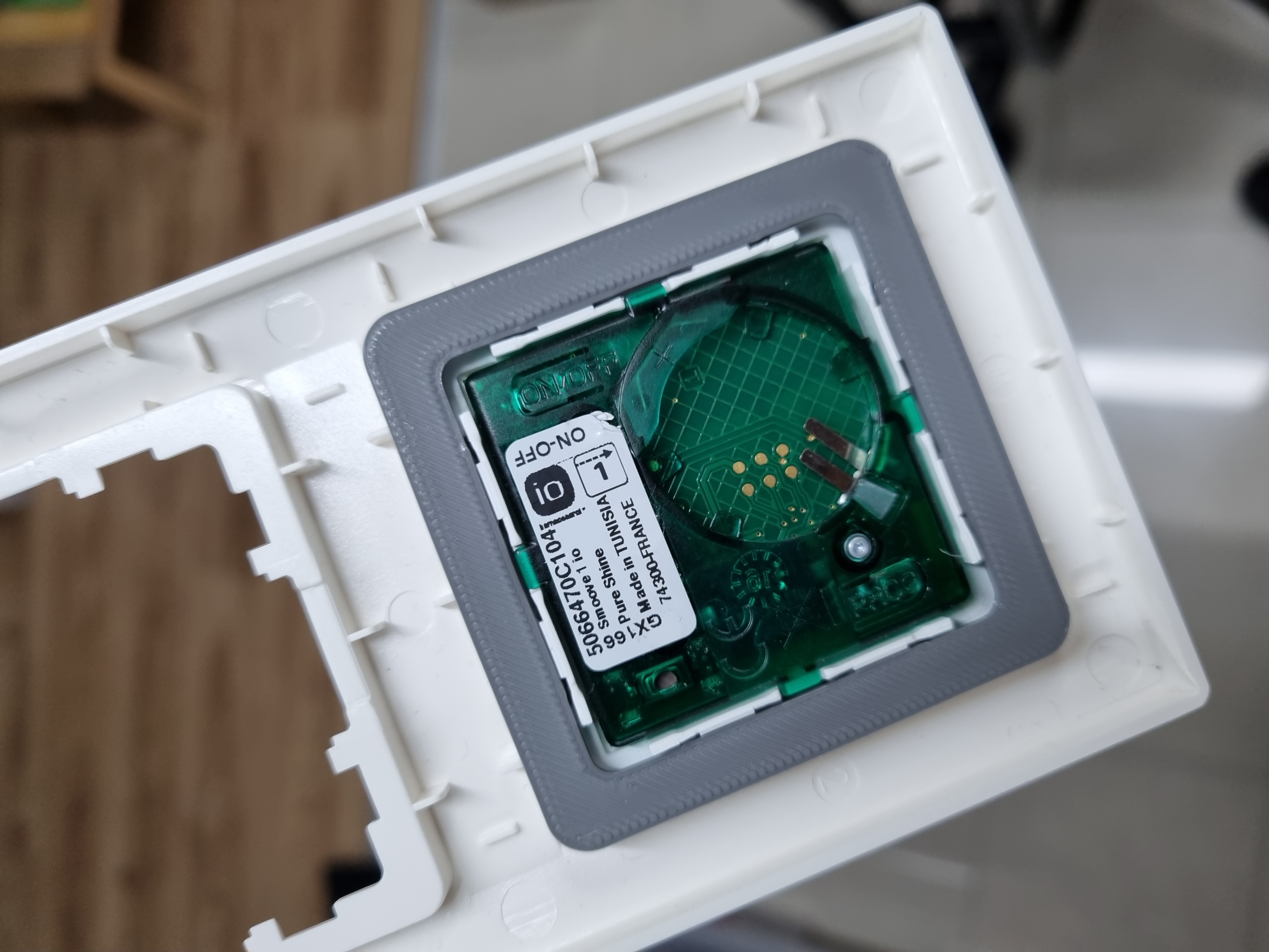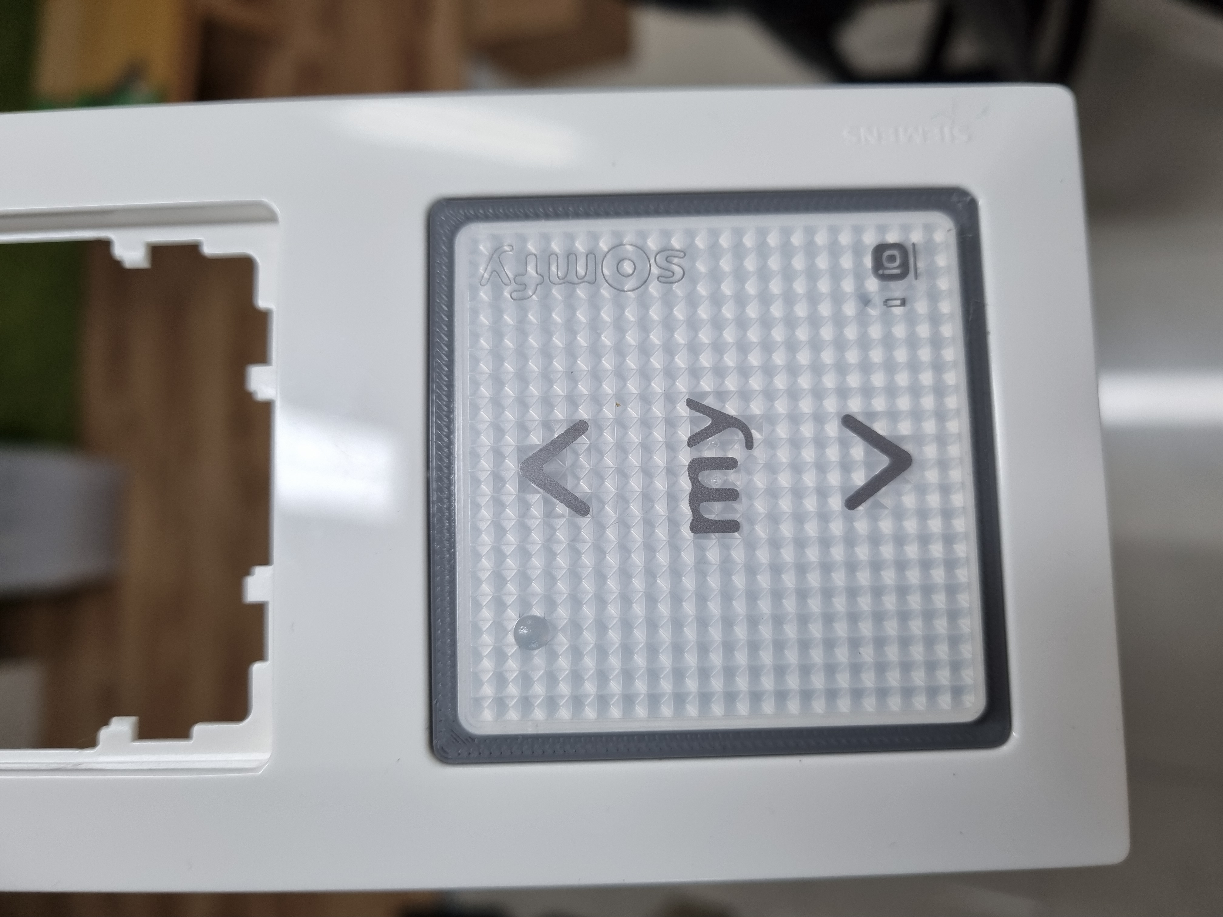 Trong trường hợp của mình, mình gắn các nút điều khiển Somfy Smoove kế bên các công tắc đã có sẵn. Vì vậy mình chỉ cần một cái vòng để nhét Smoove vô cái cover của Siemens và cố định nó từ phía sau. Không cần dán keo hay bắt vít gì hết.
