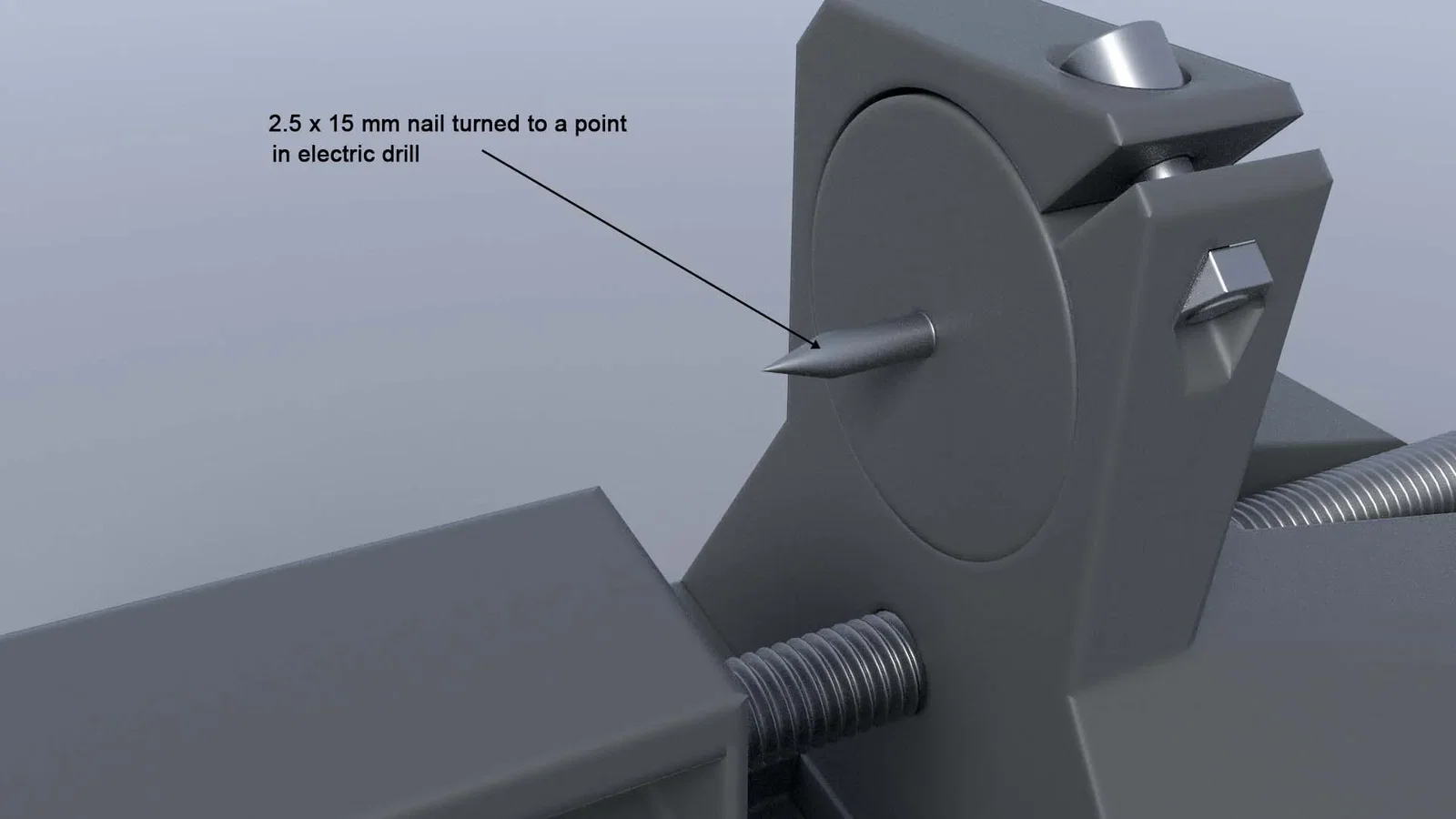 2 x Lò xo giãn 6 mm x 6 mm (khá cứng - để đỡ thân Dremel) Đinh sắt đường kính 2.5 mm x 15 mm (đã mài nhọn cho collet đuôi trục)