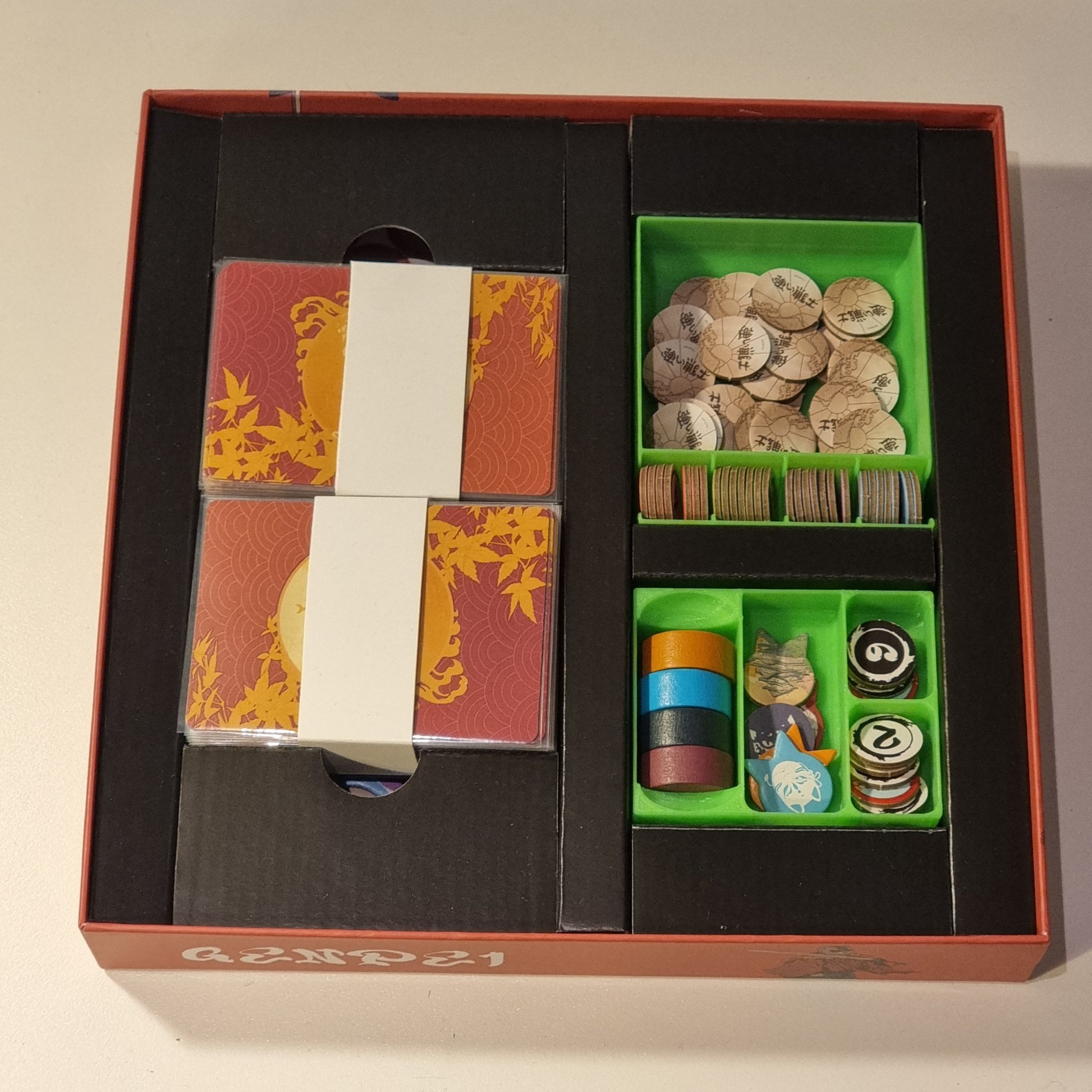 This is an insert for the base game version of the Kickstarter funded game Genpei. If you have the deluxe version this won't hold the components but for the base game it is quite useful as the game only comes with zip lock bags and two cardboard wells.