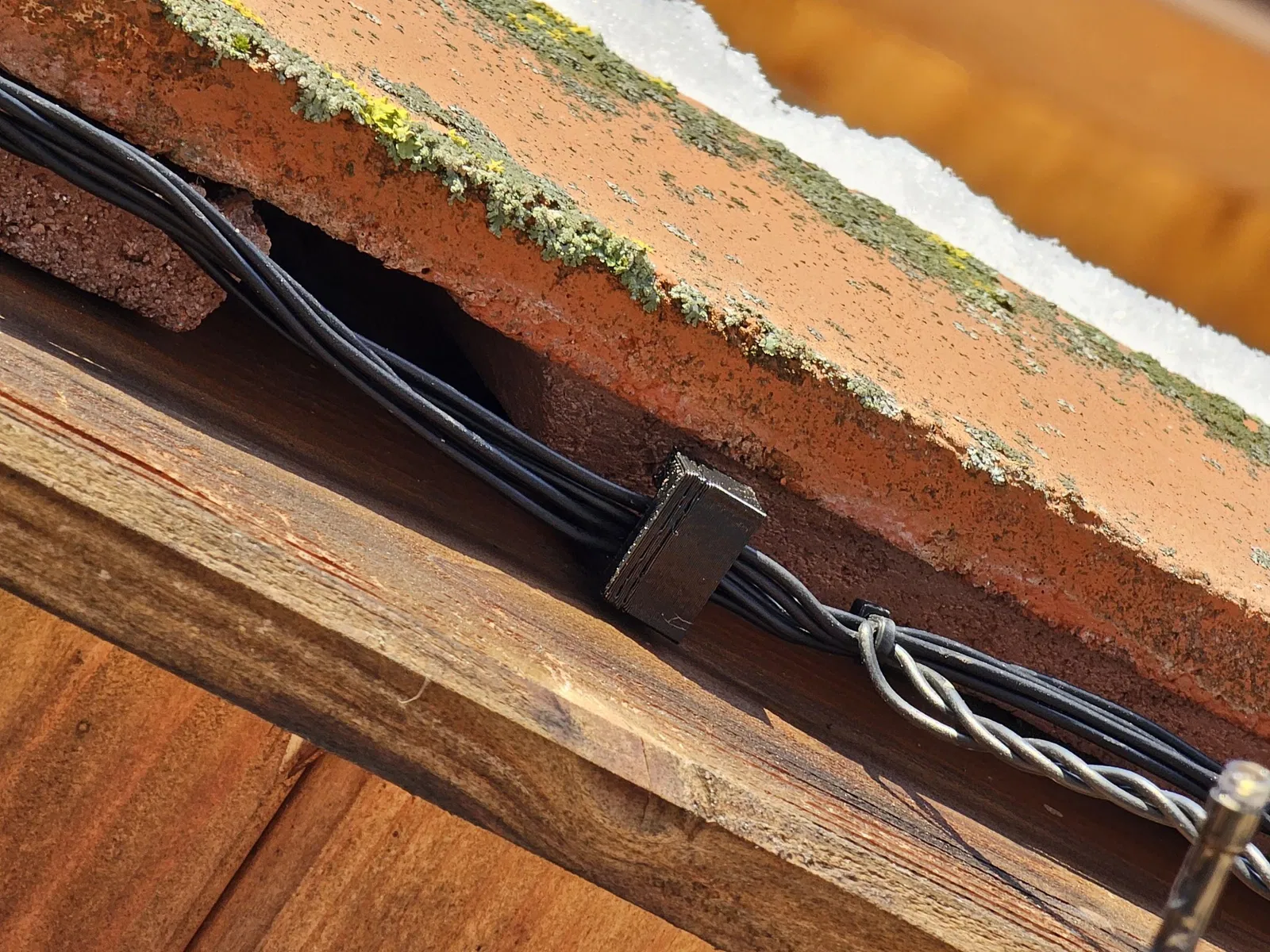 Tôi đã tạo ra một cái móc được thiết kế đặc biệt để treo đồ trang trí đèn Giáng sinh của tôi dọc theo mép mái nhà. Cái móc này được chế tạo để lắp vào khe hở giữa các viên ngói một cách dễ dàng và có thể được cố định chắc chắn giữa viên ngói và xà gồ bằng cách trượt nó sang một bên.