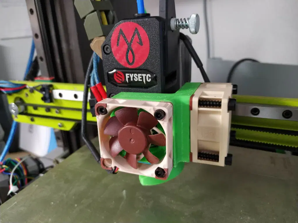 Không có nhiều quạt làm mát cho BMG Extruder xuất sắc và hầu hết đều sử dụng quạt 5015 ồn ào. Ống dẫn quạt đôi này được thiết kế đặc biệt để giữ quạt 40mm yên tĩnh, như dòng Noctua. Thiết kế này sử dụng 2x quạt 40mm, một cái để giữ cho bộ tản nhiệt của hotend mát, và cái kia để làm mát phần in. Tôi in thành hai phần. Các phần được tối ưu hóa để sử dụng ít filament nhất có thể và giữ trọng lượng thấp.