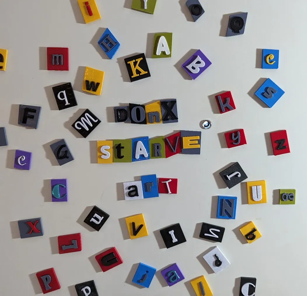 Mỗi chữ cái sử dụng một phông chữ khác nhau, với kích thước nam châm dao động từ 3,1 đến 3,5 inch.
