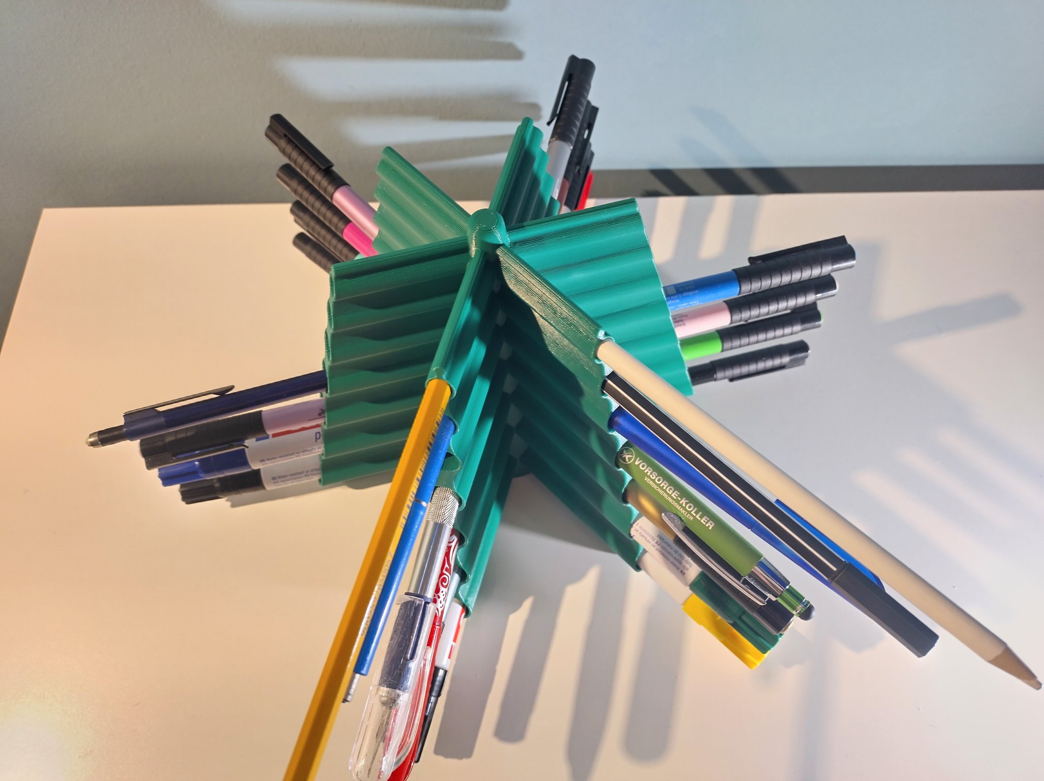 Store your pens in a festive way! The holes are slanted slightly downwards and the pens do not fall out. Supports various thicknesses of pens, from pencil to a thick permanent marker.