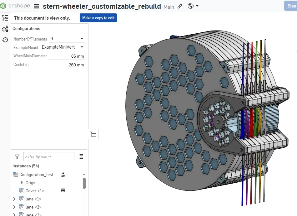 Anh em có thể tùy chỉnh kích thước của mẫu Stern Wheeler, số lượng filament và tùy chọn lắp đặt trên Onshape, rồi xuất tất cả các file theo cấu hình đã chọn ra luôn.