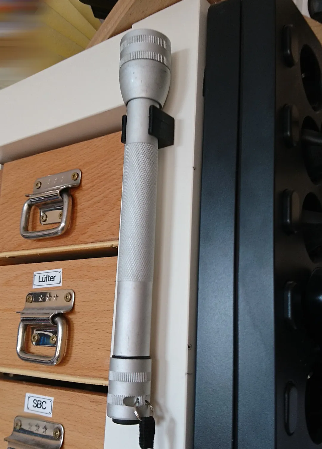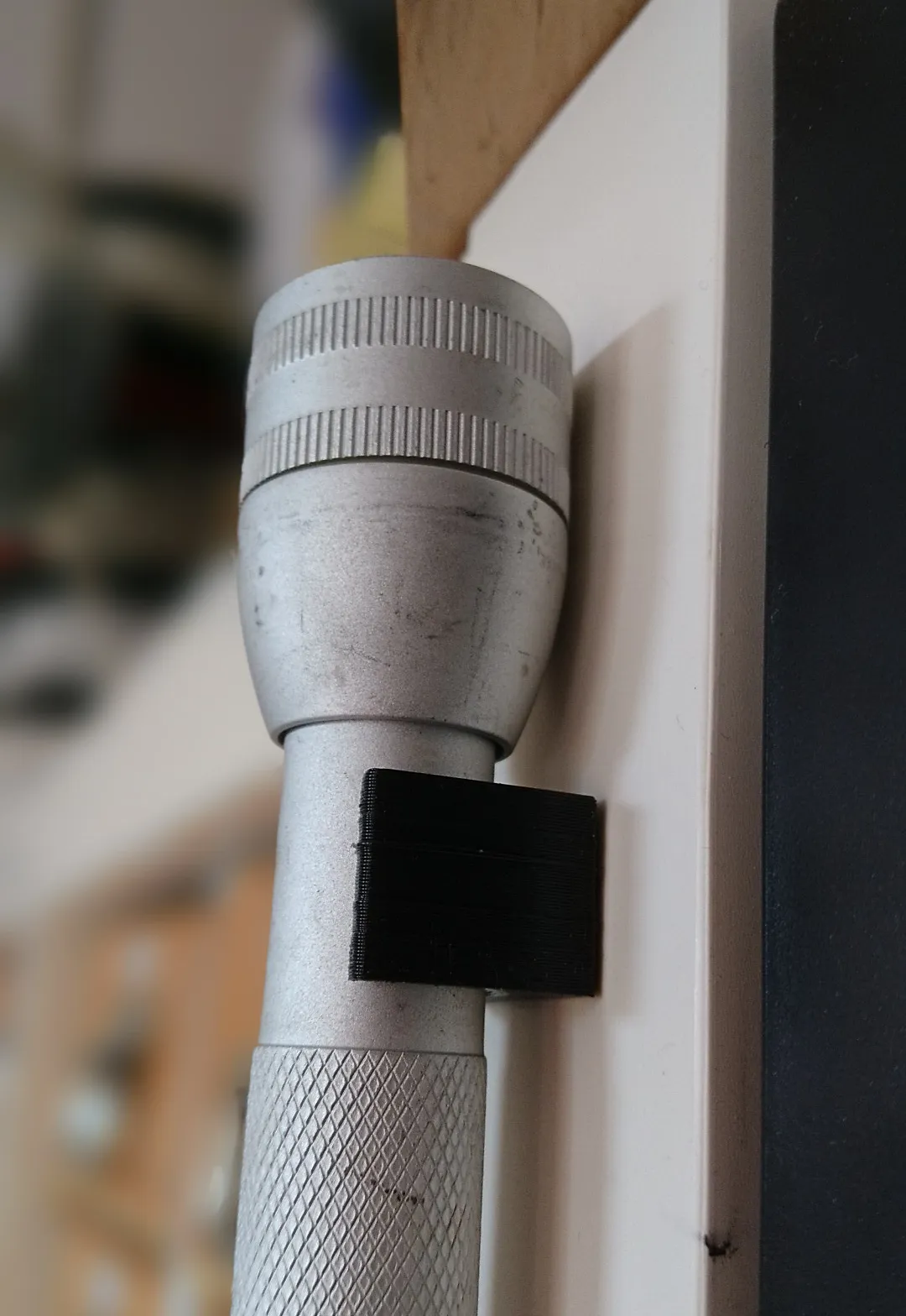Cái kẹp đèn pin để bắt vít lên tường, kệ,... Cái này dành cho đèn pin có đường kính 17mm. Nếu đường kính đèn pin của bạn khác, hãy dùng tính năng scale (tỷ lệ) của phần mềm slicer.