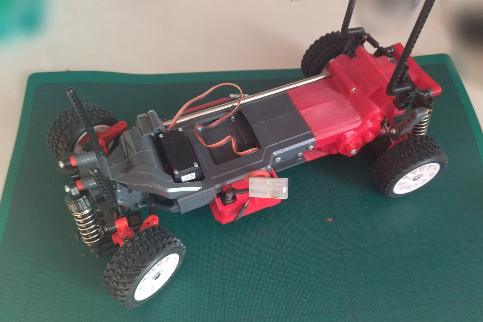 Giá đỡ/vỏ pin 96mm cho Tamiya MF-01X. Thiết kế này giúp giữ pin chắc chắn, bảo vệ pin và dây nhợ tốt hơn so với bộ phận gốc, đồng thời hơi lệch pin sang trái để tối ưu không gian.