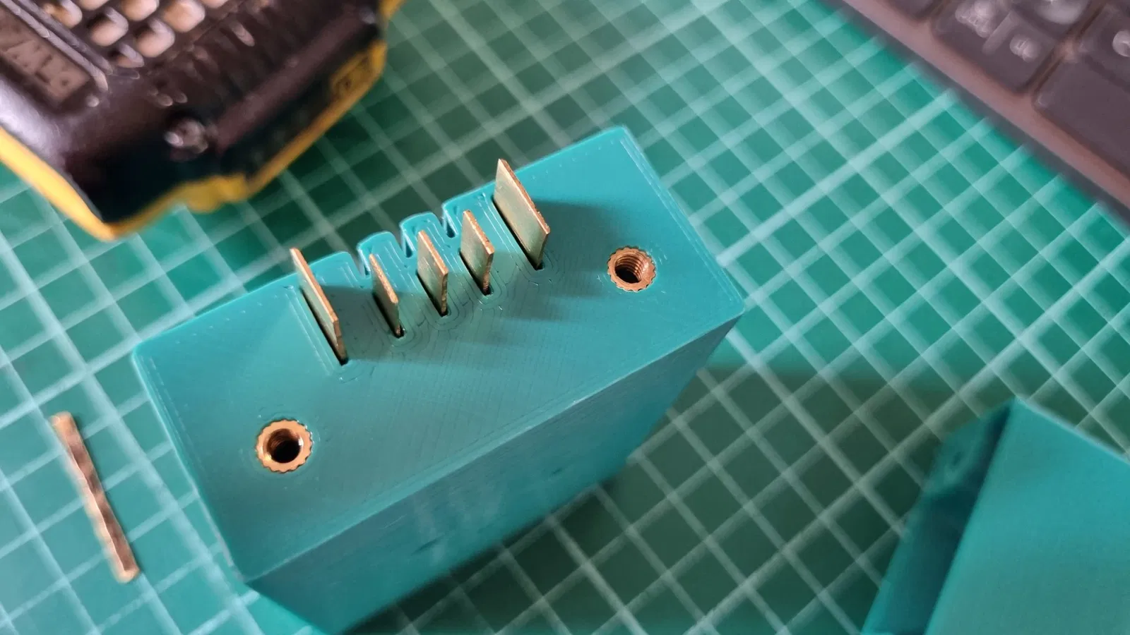 - Dải đồng thau (dày 1mm) cắt theo kích thước cho các đầu nối - sử dụng cưa sắt và dũa để tạo hình, sau đó dán siêu dính vào mỗi khe.