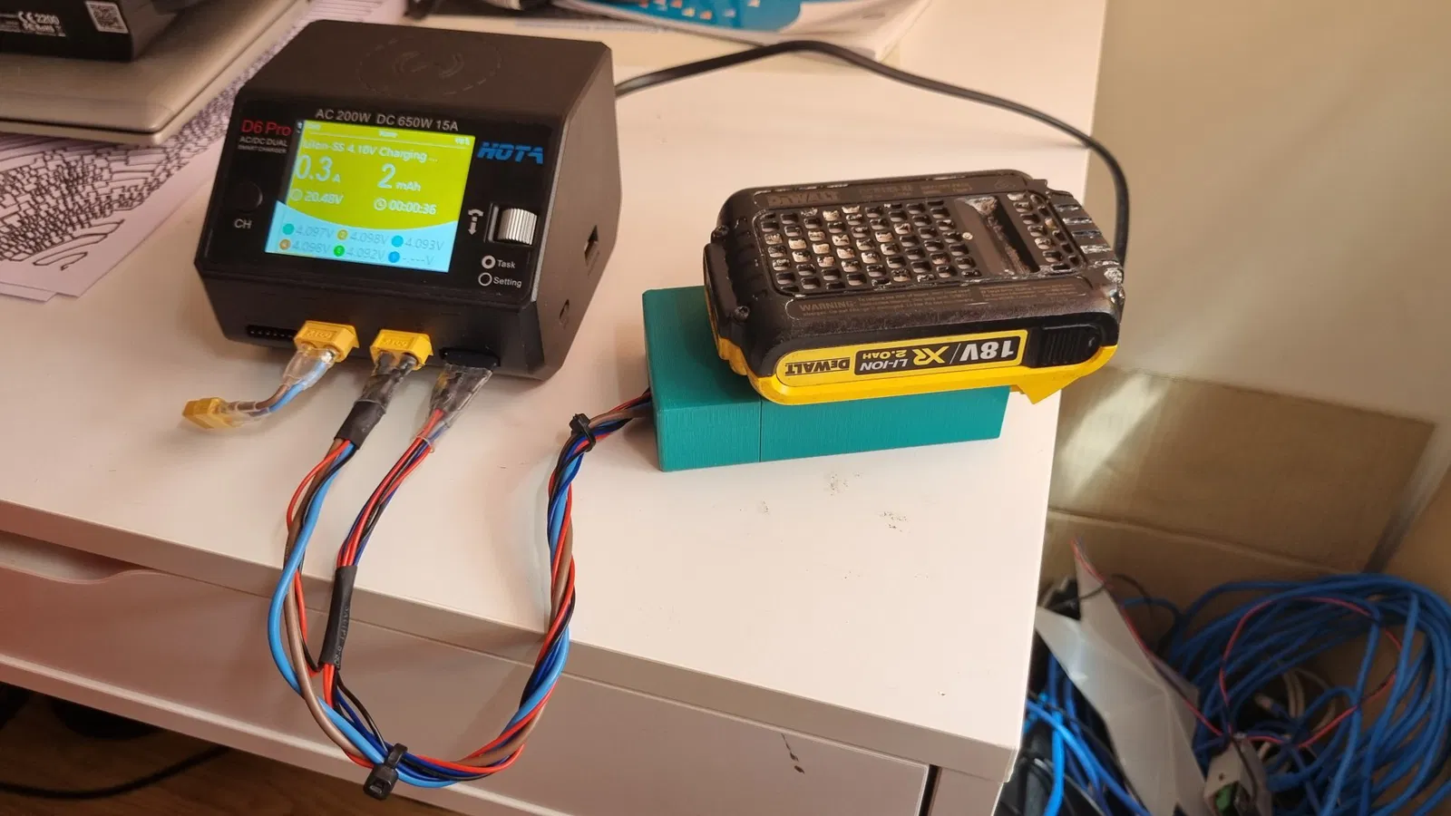 Vấn đề là theo thời gian, một số cell bị mất cân bằng, làm giảm dung lượng của mỗi lần sạc. Để khắc phục điều này, bạn có thể nhận bộ sạc cân bằng. Tôi đang sử dụng bộ sạc cho pin RC lipo. Điều này cần kết nối với mỗi cell trong pin - pin DeWalt hiển thị những điều này thông qua các kết nối nhỏ hơn trên pin.