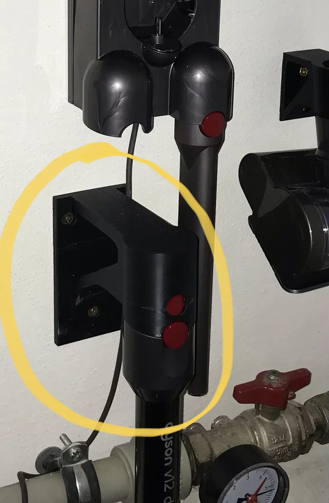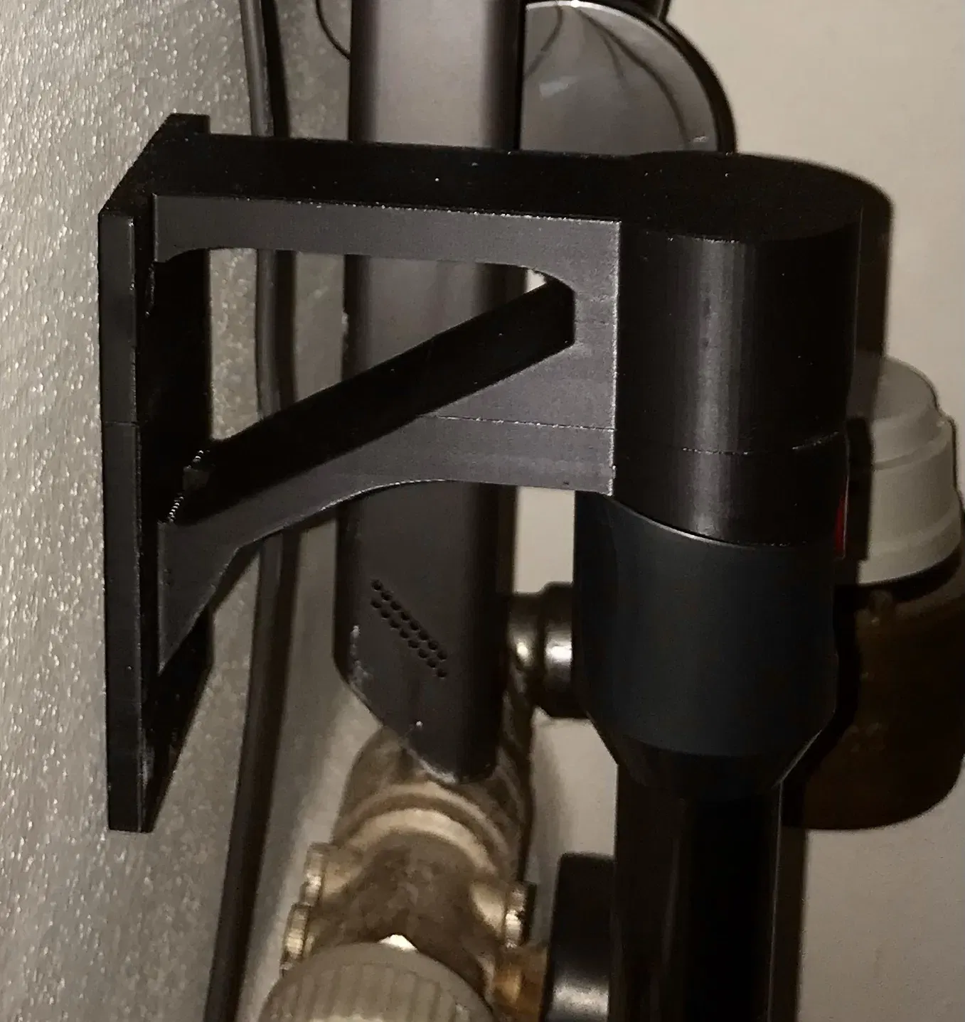 Giá treo tường cho ống hút bụi Dyson v12. Người dùng đã phóng to phần giữ và điều chỉnh nó thành một góc vuông, giúp bạn treo gọn ống hút bụi lên tường.