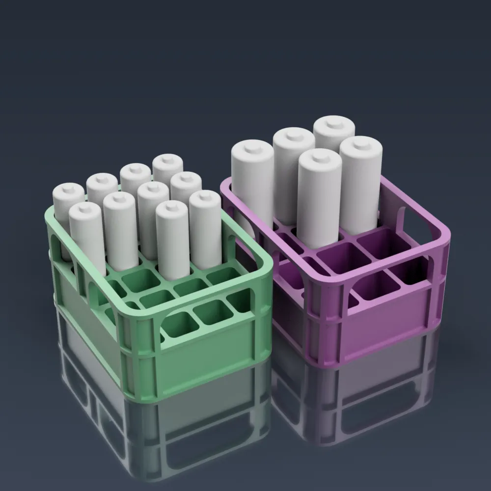 Giải pháp lưu trữ pin AA và AAA theo kiểu thùng bia. Thùng pin AA chứa được 12 viên, thùng AAA chứa được 20 viên. In bằng PLA, không cần hỗ trợ hay vật liệu độn. Kích thước 69,7 x 53,4 x 35,0mm.