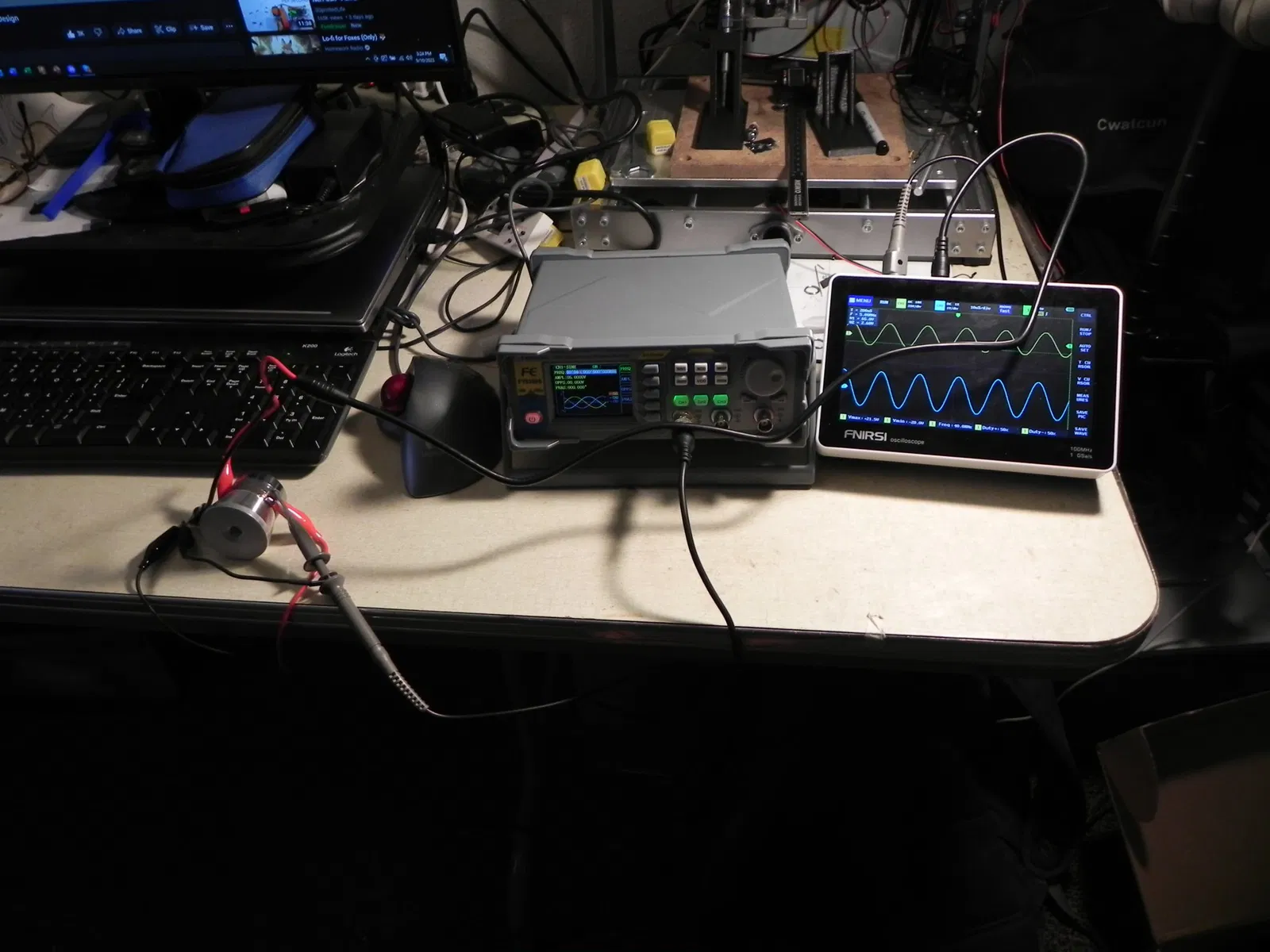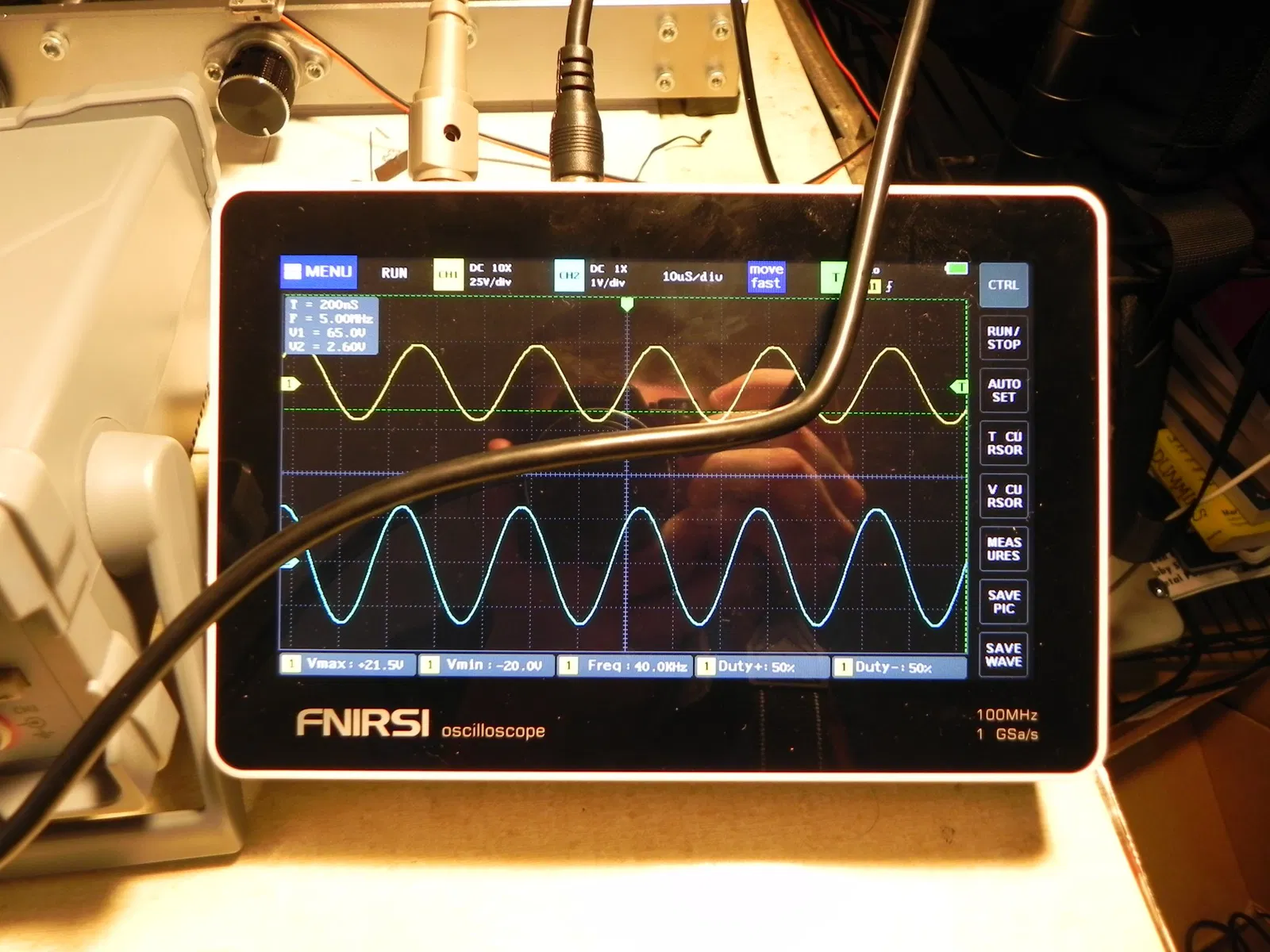 và chắc chắn còn nhiều chỗ bán khác nữa. Đây là một mẫu phổ biến. Tôi đã đính kèm hình ảnh màu thực tế về đầu ra của bộ chuyển đổi khi được điều khiển bằng dạng sóng hình sin, sự sụt áp (đường màu xanh) trên một điện trở 100 ohm khi được điều khiển bằng 18V (đường màu vàng) ở khoảng 100 mA từ máy tạo hàm của tôi.