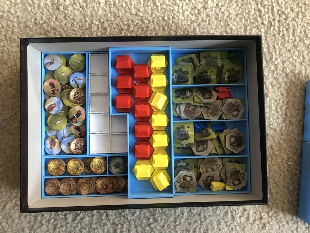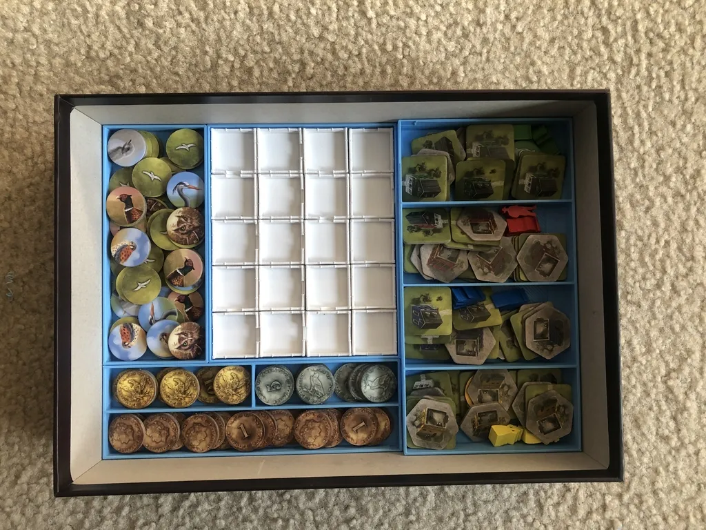 Insert designed to house the components for Cape May. Creating this design to be able to accommodate sleeved cards was a big challenge. The tolerances for this build are tight, but as you can see by the pictures, it works, and the lid sits flush. If you store your games vertically, I suggest placing the trays in like the pictures with the tokens all on the bottom so that the card and building trays keep tokens in place.