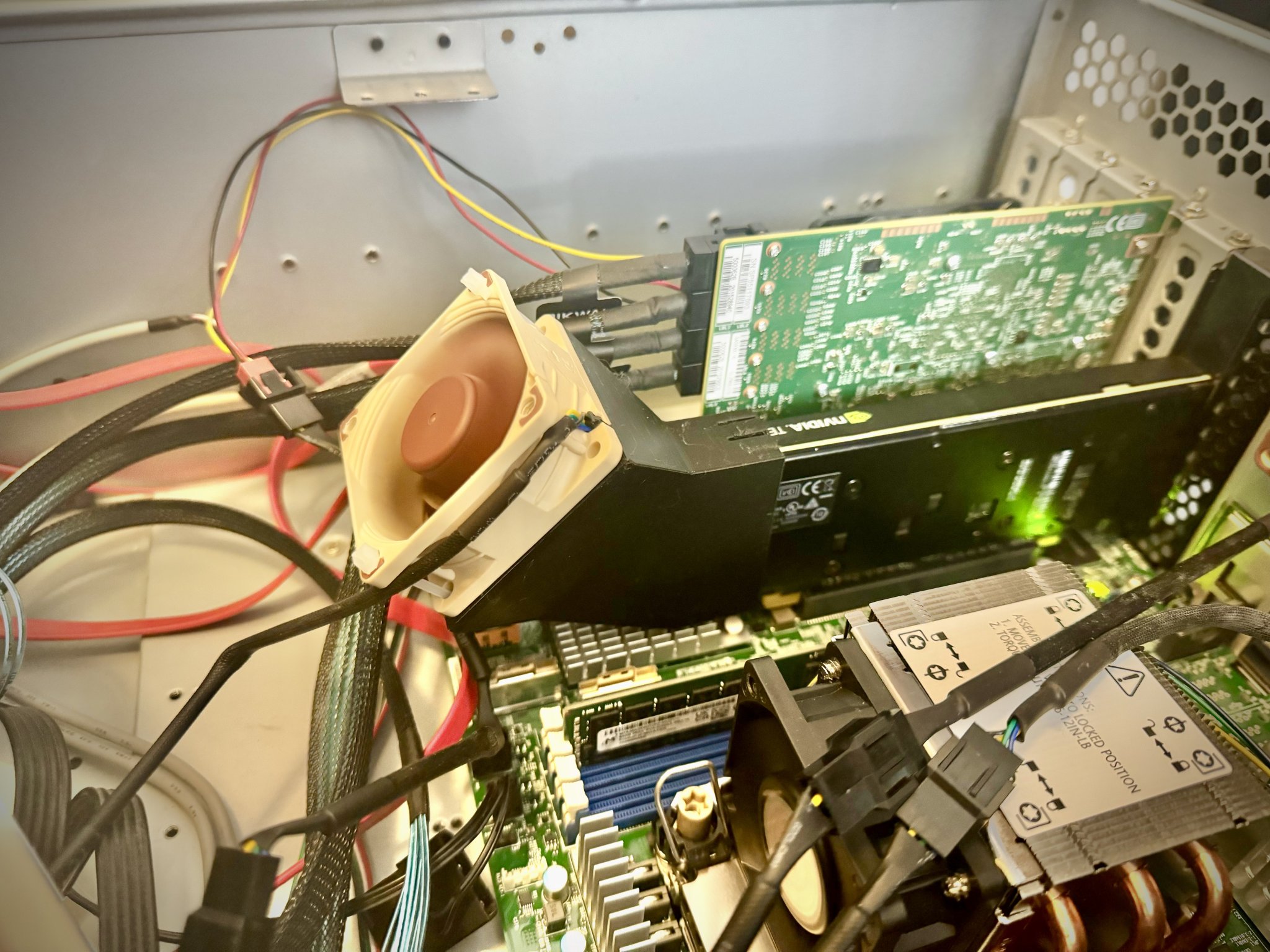 Card Tesla P4 không có quạt tích hợp sẵn, nhưng mà cái đế quạt 60mm này có thể gắn vô để giải nhiệt cho nó nha. File có cả loại gắn thẳng cho chỗ nào thoáng đãng, với loại gắn xéo cho mấy trường hợp bị vướng cổng SATA hay linh kiện khác. Cái loại gắn xéo thì cần case 3U trở lên mới vừa nha.