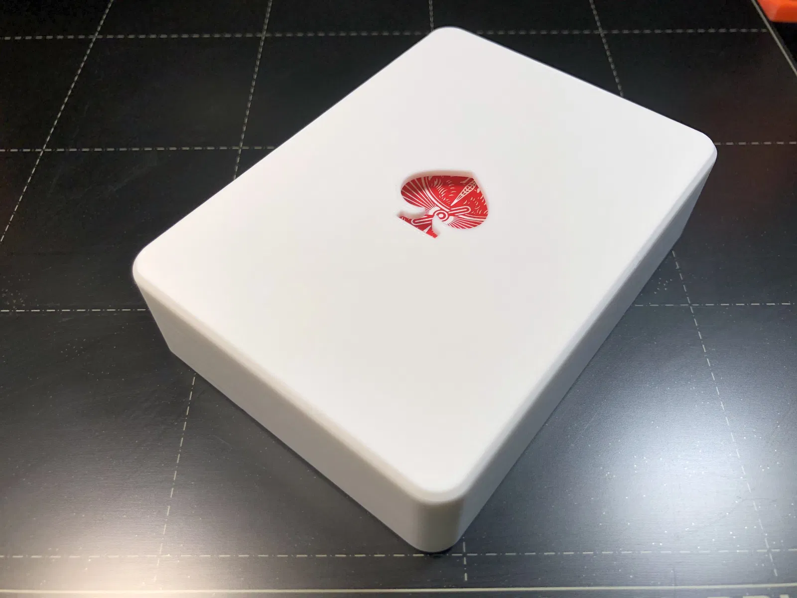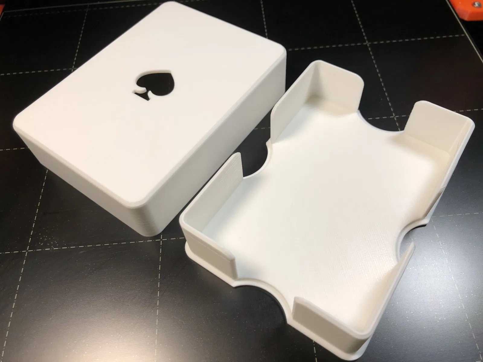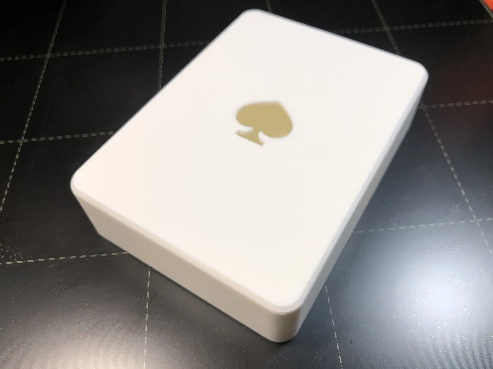 Cái này có kích thước hoàn hảo cho bộ bài 52 thẻ của thương hiệu Bicycle (có chỗ trống cho các thẻ joker, v.v.). Kích thước bên trong của hộp này là 64mm x 88.3mm x 20mm (cộng thêm 0.3mm dung sai xung quanh chiều rộng và chiều dài). Tôi đã xuất thiết kế sang định dạng STEP và bao gồm nó bên dưới trong trường hợp bạn cần kích thước khác cho thương hiệu bài chơi của bạn. Cấu trúc là tham số, chỉ cần cập nhật các biến cho Chiều rộng, Chiều dài, Chiều cao, Dung sai và Bán kính để phù hợp với nhu cầu của bạn.