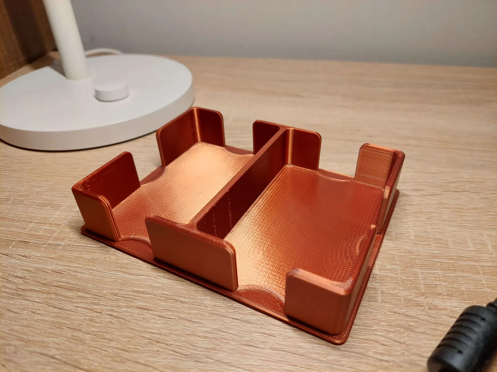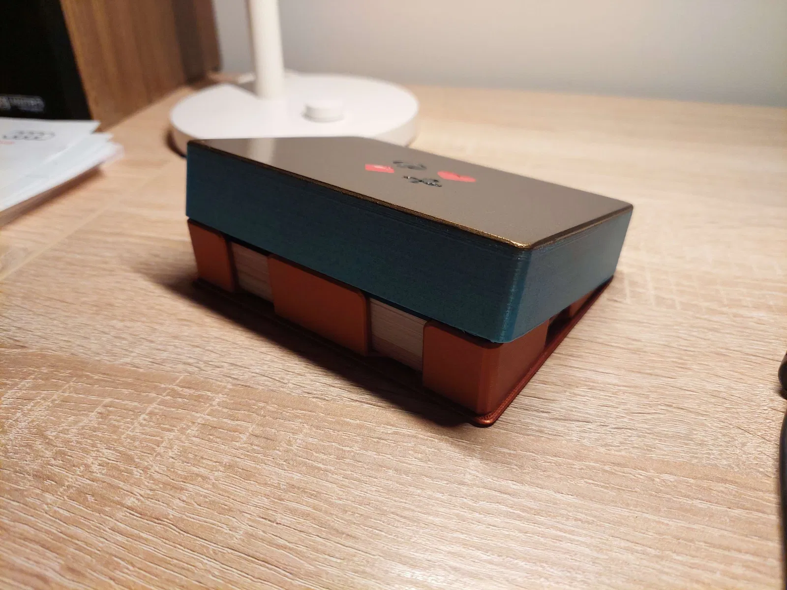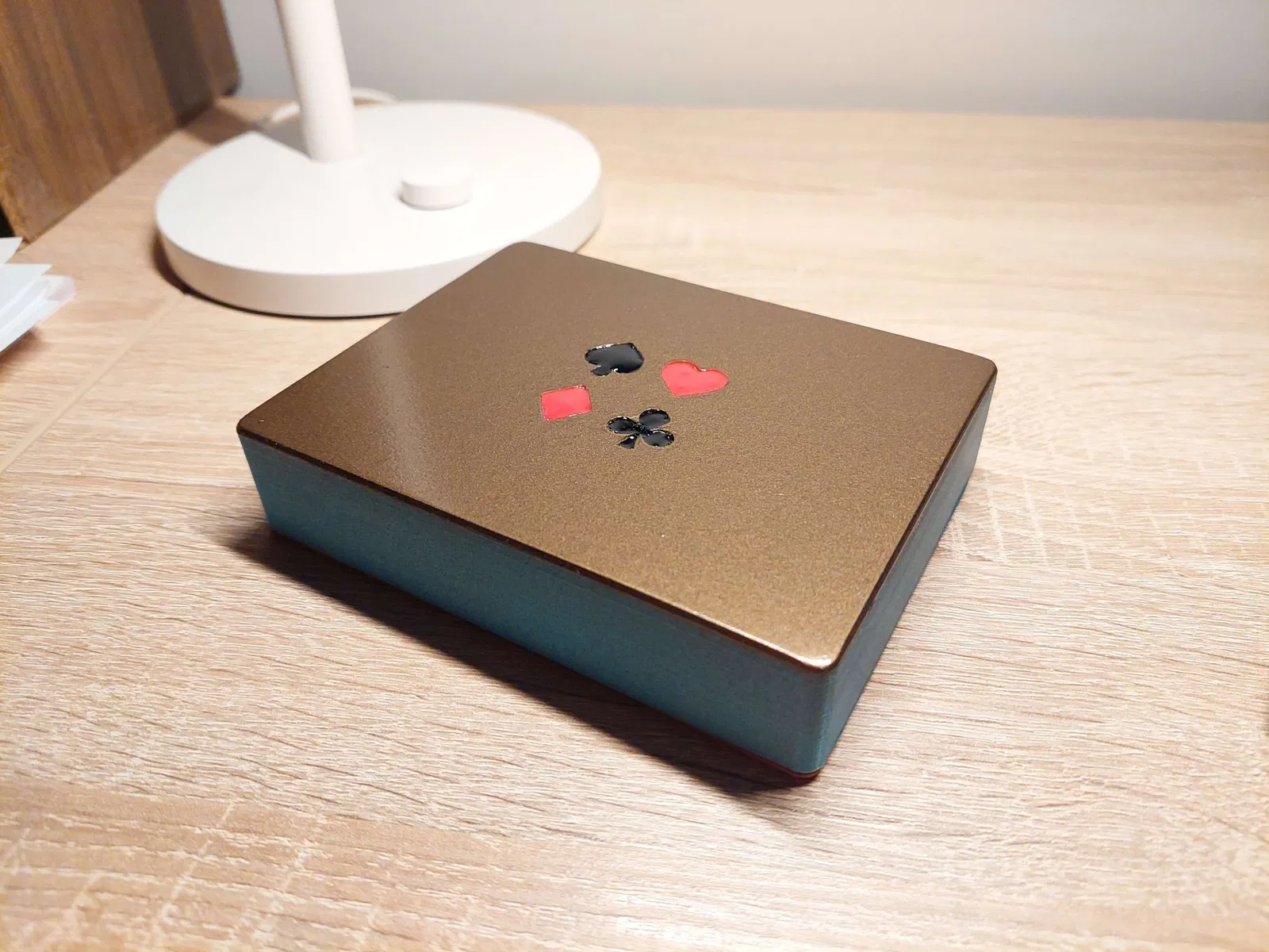 Bản remix đẹp của Hộp Bài được thiết kế cho bộ bài đôi. Nắp vừa khít với đáy và độ chính xác của các lá bài cũng khá chặt chẽ. Được làm cho các lá bài Tyskie (đúng vậy, tôi đến từ Ba Lan) có kích thước 56 x 87 mm. Nắp của tôi được sơn bằng sơn xịt và sơn móng tay đã được đổ vào các lỗ.