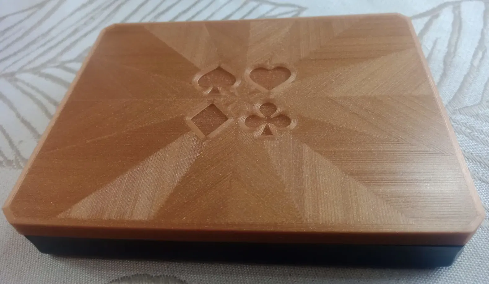 Tôi là một người ủng hộ lớn việc giảm thiểu và tái chế, vì vậy khi hộp bài poker của mẹ tôi bắt đầu phân hủy, tôi đã quyết định tạo ra các bộ phận thay thế và thêm một chút phong cách cho nó. Thiết kế phù hợp với bộ bài đôi được đánh dấu là “ROYAL 100% PLASTIC” sản xuất tại Ấn Độ, vì vậy nếu bạn tình cờ có cái giống như vậy, nó sẽ vừa vặn, nếu không thì tôi bao gồm mô hình Freecad với một bản phác thảo tham số để bạn có thể dễ dàng điều chỉnh theo nhu cầu của mình. Nếu bạn chưa sử dụng Freecad, hãy xem các hướng dẫn trên YouTube hoặc gửi cho tôi một dòng tin nhắn và tôi sẽ rất vui lòng giúp đỡ. Nếu bạn tạo ra một mô hình mới, xin hãy tải lên để người khác có thể hưởng lợi từ nó. Để có vẻ ngoài tốt hơn, tôi đã lấy các hình dạng poker từ Apudapuk thiết kế và sử dụng Spiral Octagram làm mẫu điền dưới cùng trên tấm PEI mịn, tạo ra một lớp hoàn thiện rất bóng. Các bộ phận có thể hoán đổi cho nhau, vì vậy bạn có thể thay thế chỉ nắp, đáy hoặc cả hai tùy theo nhu cầu của bạn. Chúc bạn in ấn vui vẻ và mong chờ được thấy các sản phẩm của bạn.