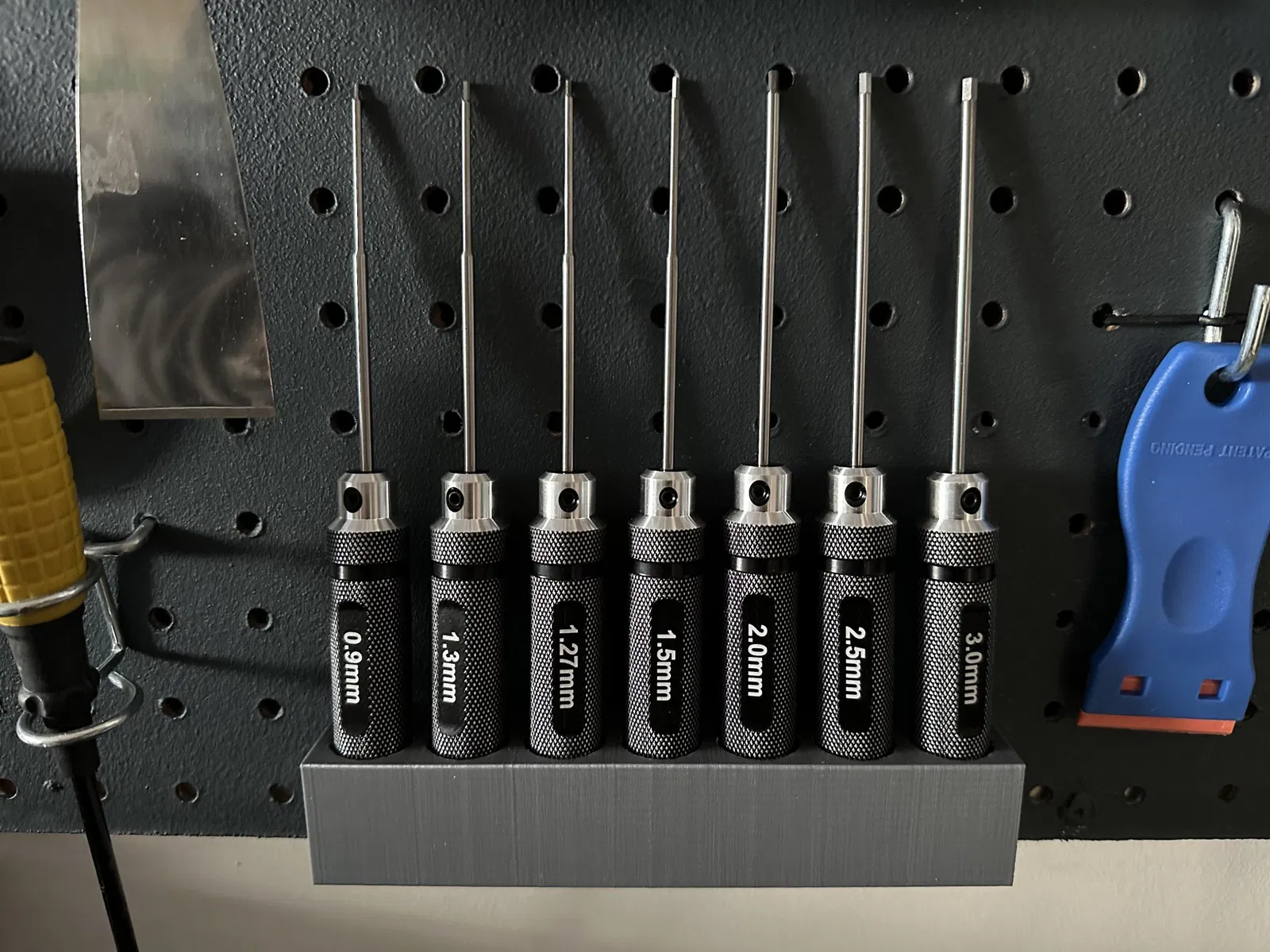 Cái giá này là để treo mấy cây lục giác lên bảng treo đồ với lưới 1 inch. Tuyệt vời cho mấy anh em hay xài đồ nghề lục giác!