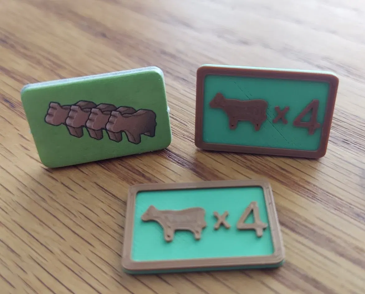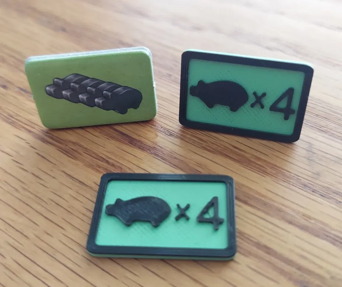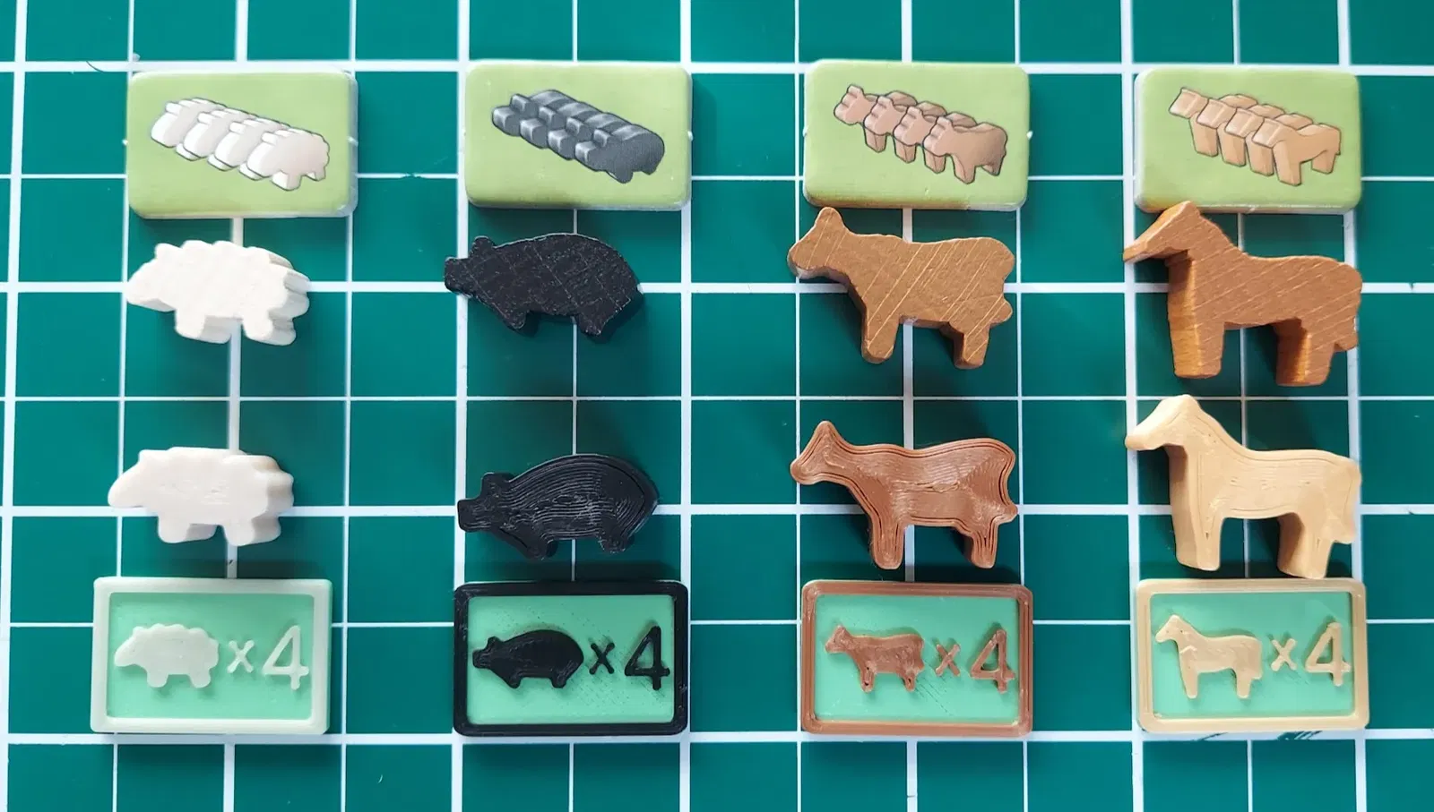 Cừu: eSun Bone White PLA Heo: Sunlu Black PLA Bò: Hatchbox Copper PLA Ngựa: Hatchbox Gold PLA (Các token gốc của bò và ngựa có màu sắc quá giống nhau nên tôi cố tình dùng màu vàng kim khác cho ngựa) Đế x4: Creality Matte Green PLA
