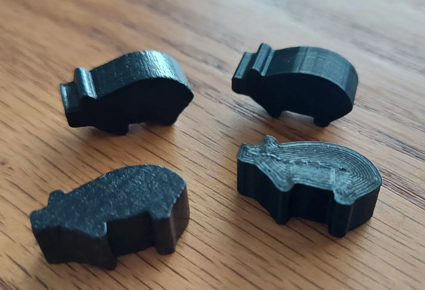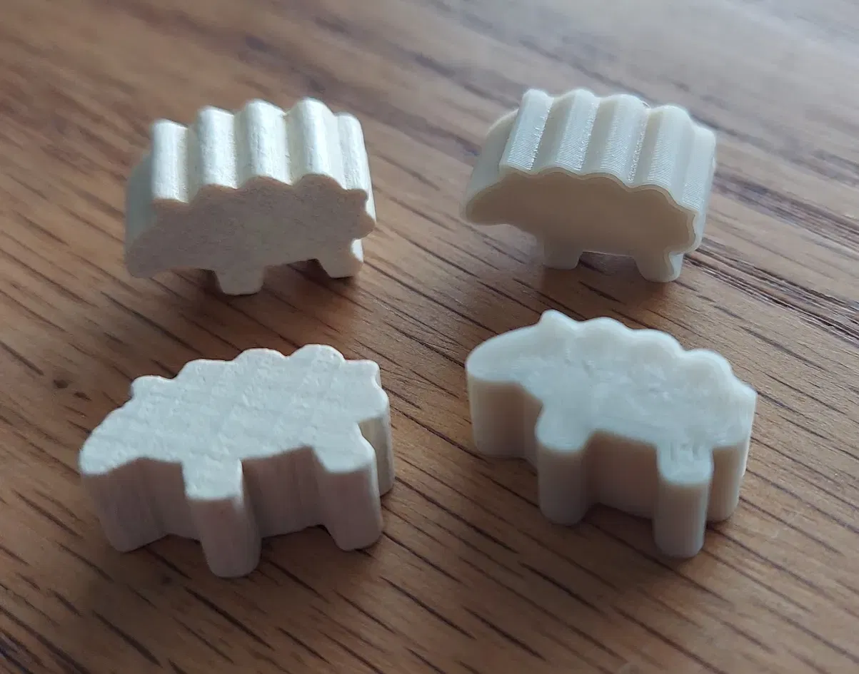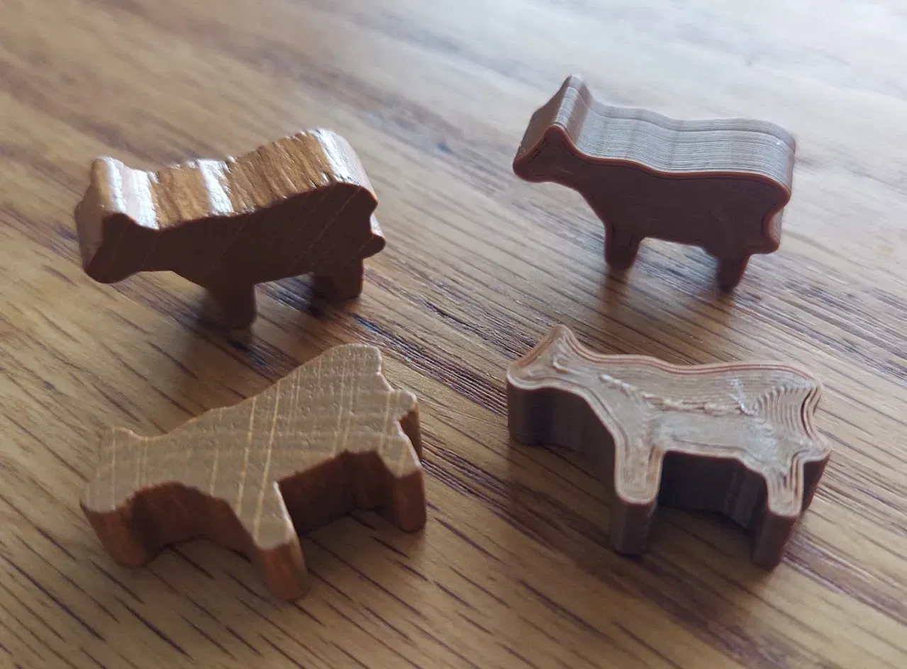 Cừu: eSun Bone White PLA Heo: Sunlu Black PLA Bò: Hatchbox Copper PLA Ngựa: Hatchbox Gold PLA (Các token gốc của bò và ngựa có màu sắc quá giống nhau nên tôi cố tình dùng màu vàng kim khác cho ngựa) Đế x4: Creality Matte Green PLA