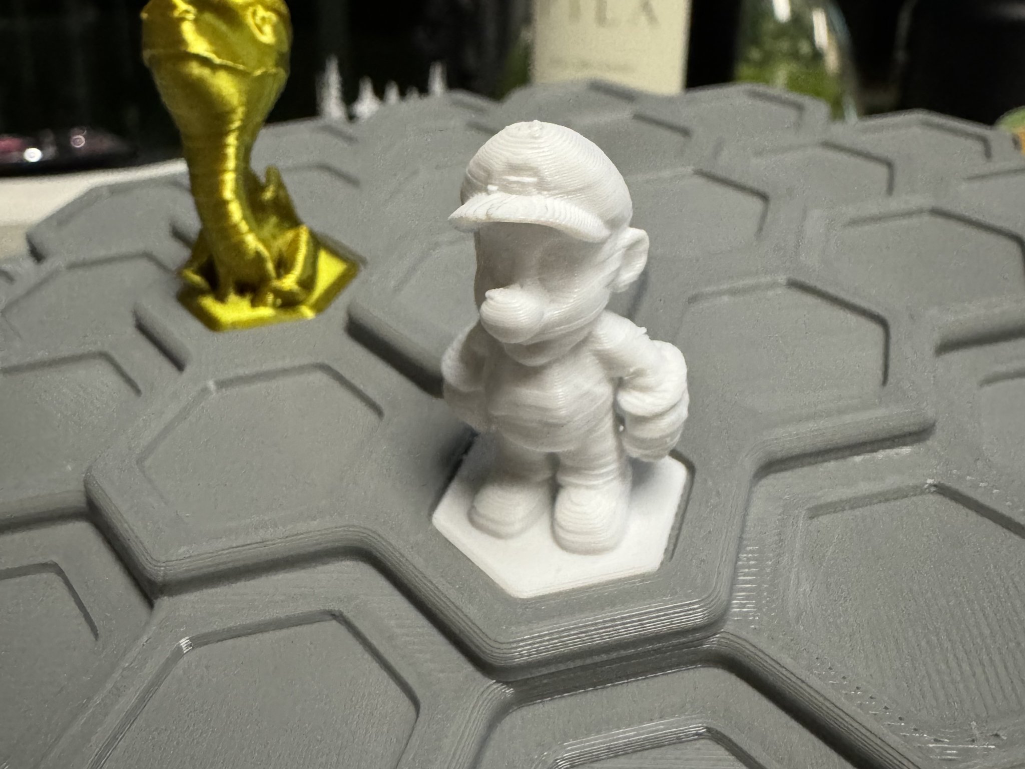 Mô hình Mario được thiết kế để đặt vừa vào game thăng bằng Prusa. Bản V2 đã được chỉnh sửa để Mario dính liền mạch với đế và có kích thước lớn hơn, cân bằng hơn với mô hình rồng gốc. Cần support khi in.