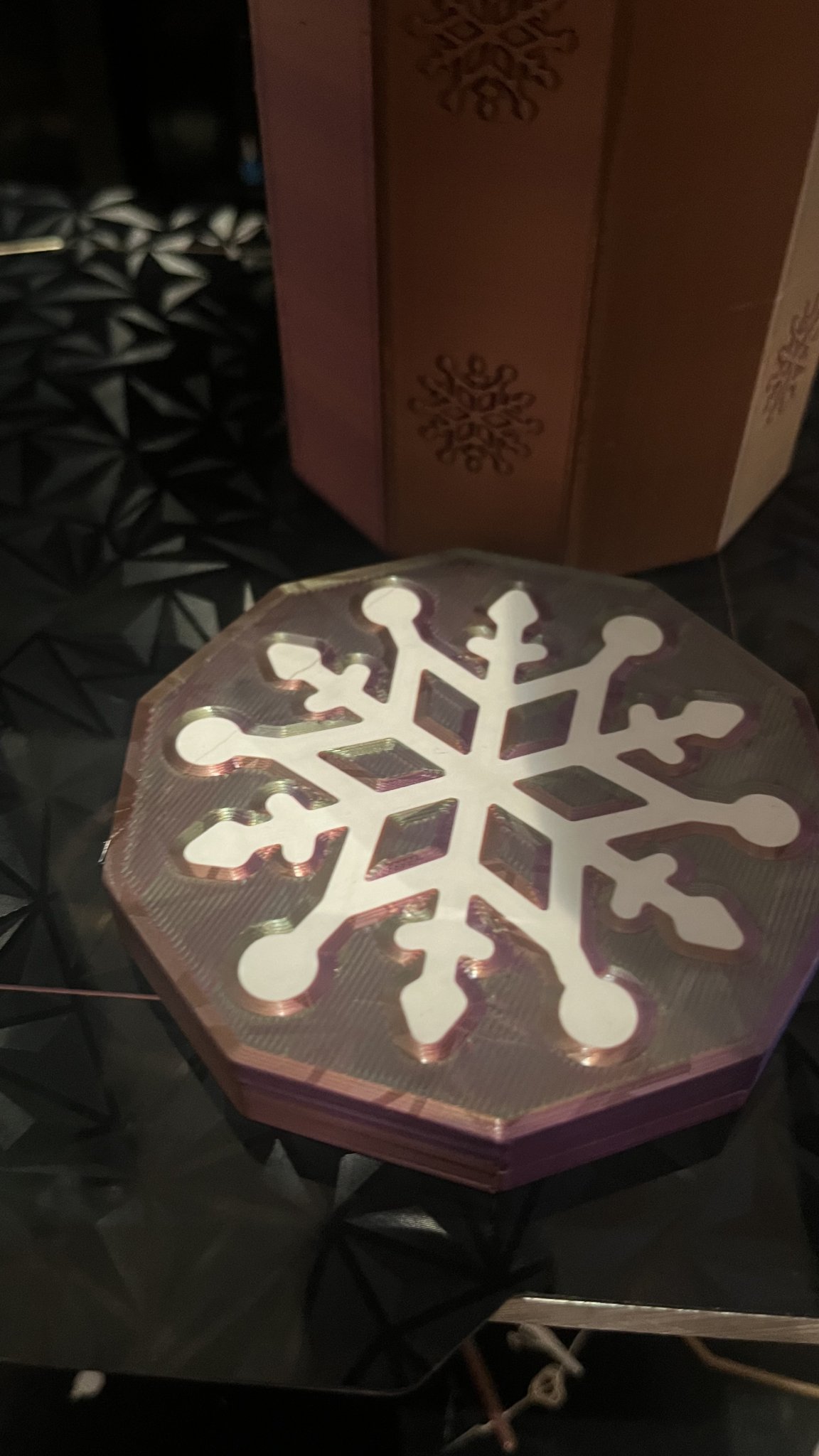 Một chiếc hộp quà Giáng Sinh đơn giản, với họa tiết bông tuyết dễ thương và phần nắp hộp có thể in hai màu sắc khác nhau, thích hợp để đựng quà tặng trong dịp lễ.