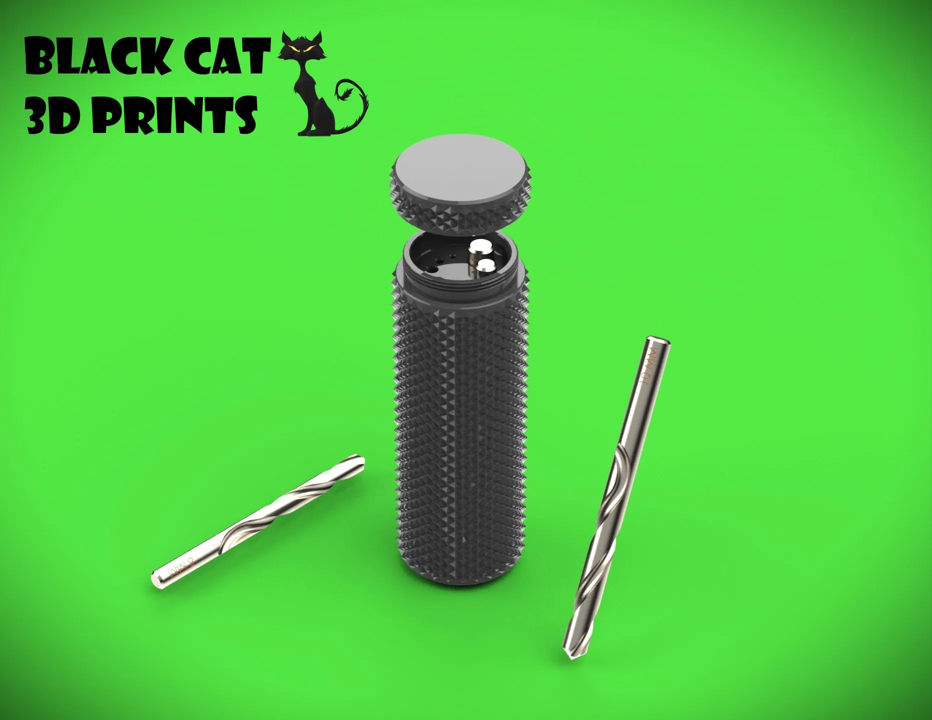 Hộp đựng mũi khoan hình trụ chắc chắn với nắp xoáy, có hoa văn vân xoắn. Kích thước ren M10x1.5, lý tưởng để lưu trữ mũi khoan.