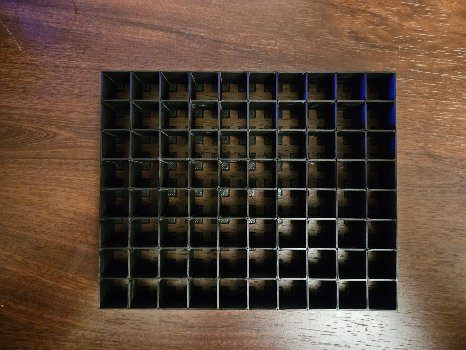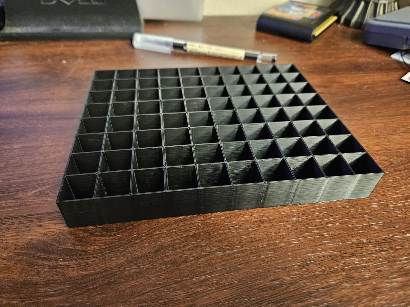 Cái kệ đựng 80 cây bút marker cồn này là do con gái tui nó nhờ làm, thay cho cái hộp giấy ban đầu. In bằng Prusa Mini+ không support, không brim, chỉ cần một chút vật liệu thôi là có ngay cái kệ xịn sò.
