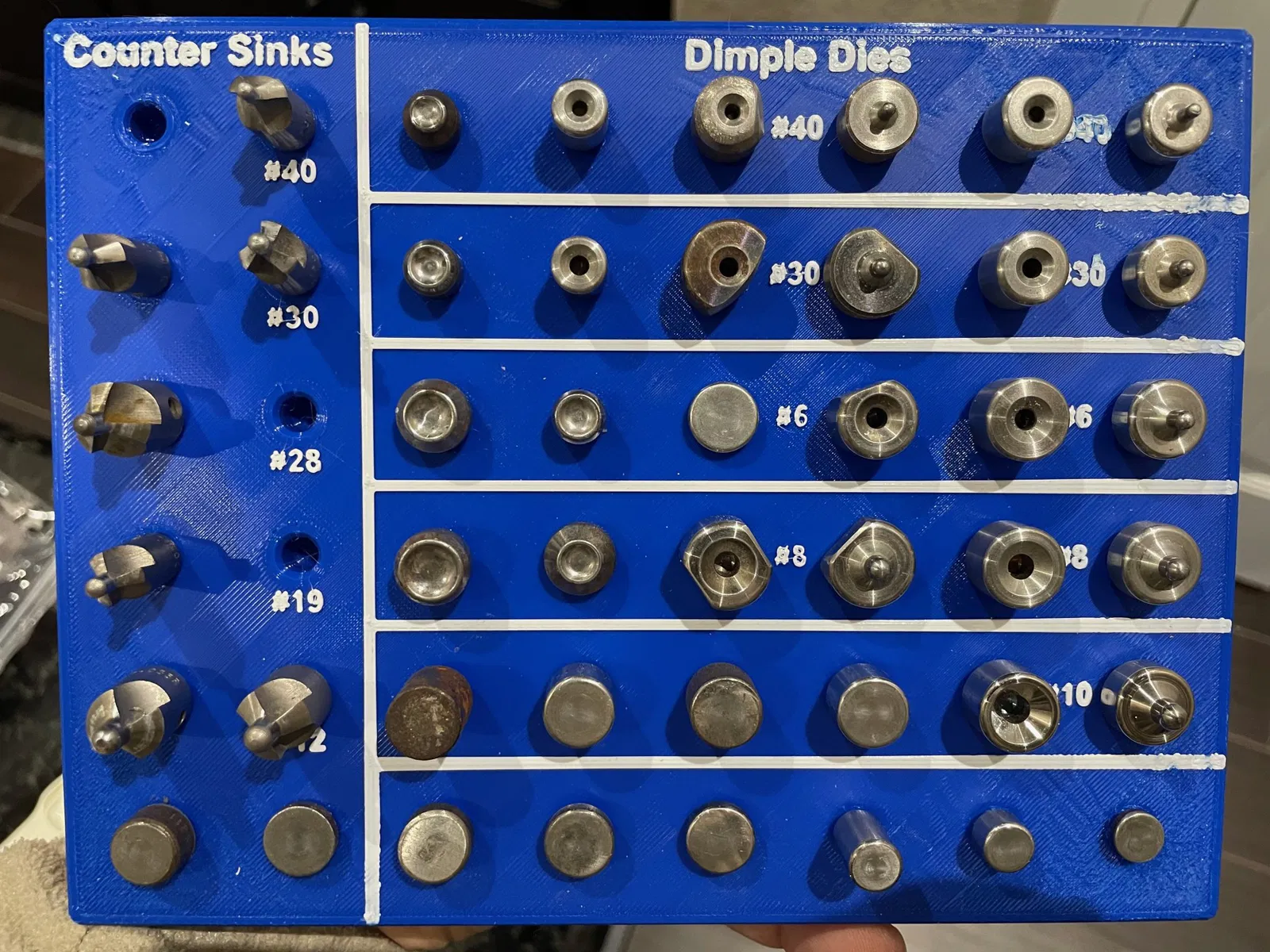 Đây là một cái đế/hộp đựng cho bộ dụng cụ Dimple Dies và Countersink của bạn, dùng để chế tạo máy bay bằng nhôm. Đây là bộ sưu tập của tôi khi chế tạo chiếc RV-9/RV-10.