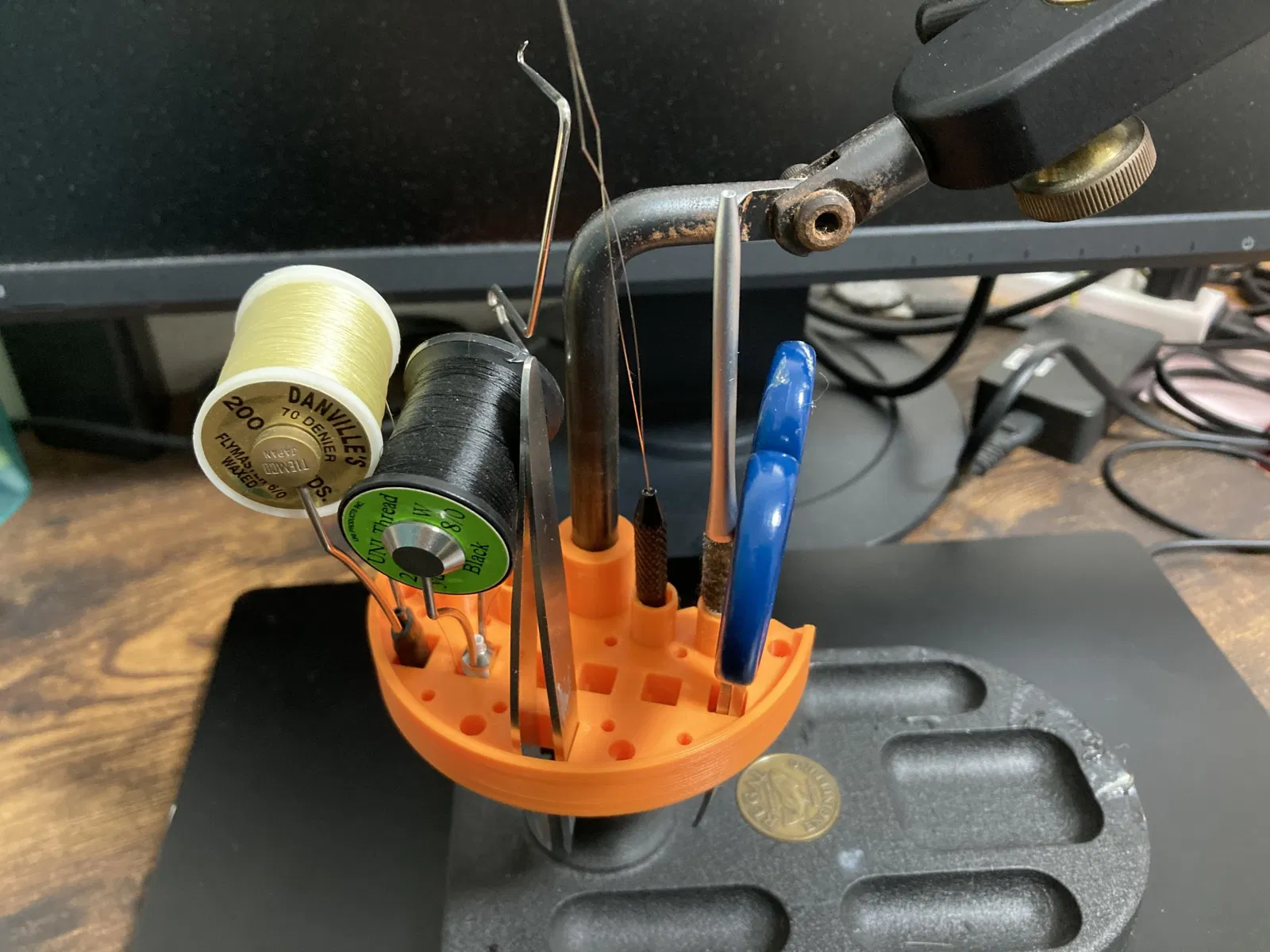 Một cái giá giữ đồ nghề rất tiện lợi cho máy kẹp Regal, giúp anh em sắp xếp dụng cụ câu cá bay (fly fishing) gọn gàng hơn khi đang chế tác mồi.
