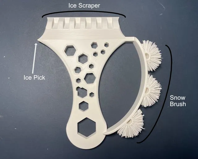 Dụng cụ cạo băng đa năng này là cứu cánh cho xe hơi của bạn trong những ngày tuyết rơi và băng giá. Tích hợp lưỡi cạo băng, mũi phá băng và bàn chải cào tuyết, sản phẩm này cực kỳ hữu ích. Bạn có thể in bằng PLA và điều chỉnh kích thước cho phù hợp với bàn tay của mình.