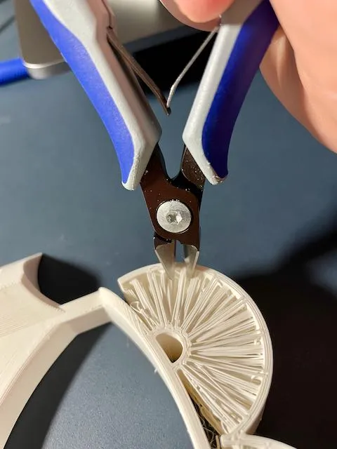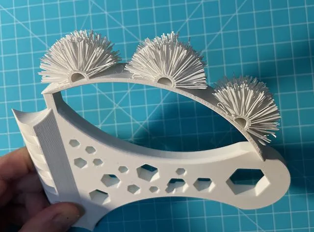 Nó đi kèm với các bộ phận hỗ trợ cần thiết cho bàn chải (trong tệp .stl). Xin vui lòng, sử dụng kềm cắt để loại bỏ chúng, cắt càng sát với bộ phận hỗ trợ càng tốt (xem hình ảnh).