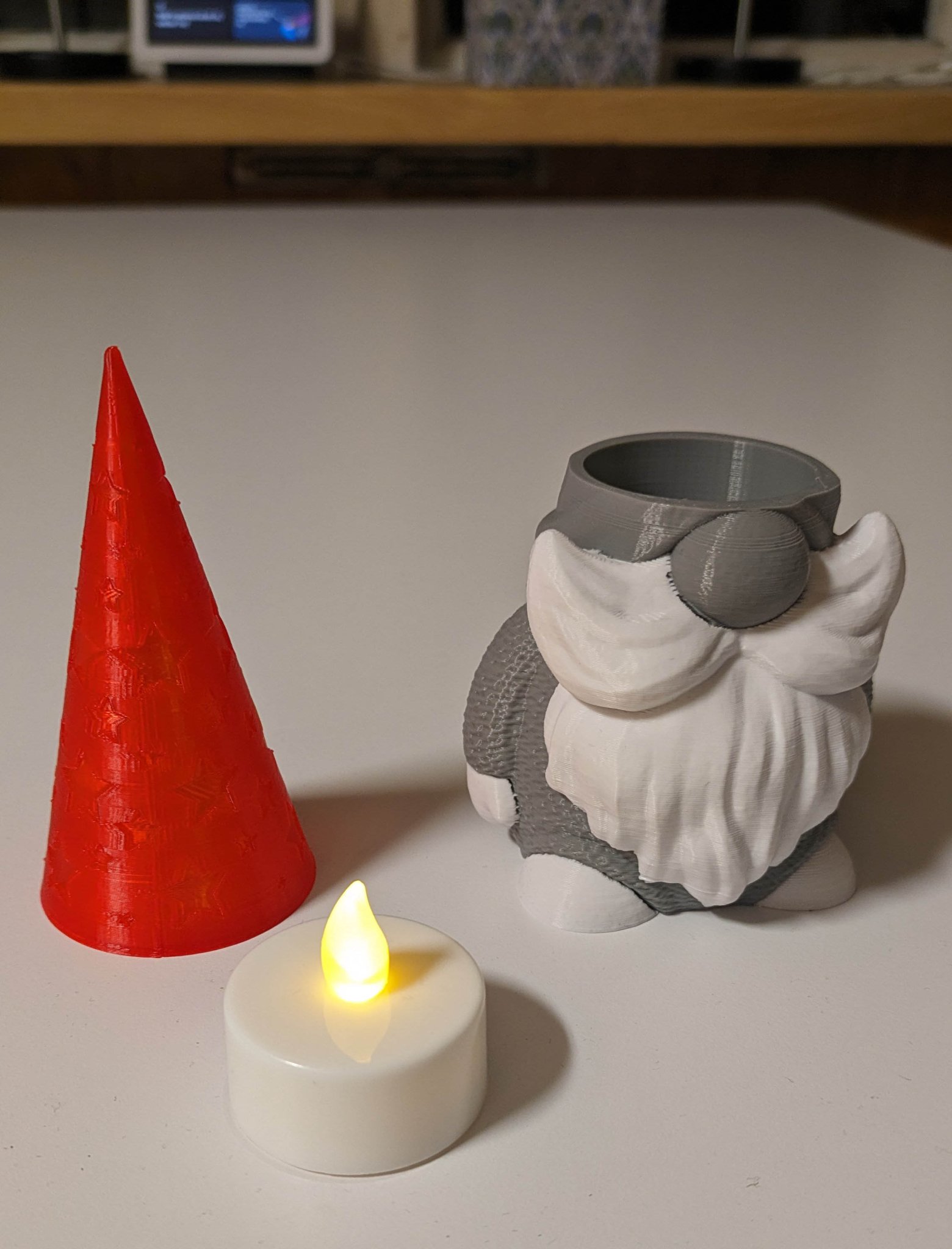 Made a hole for the led-light in the gnome as well in the tea light. Painted i Prusa for multicolor. A single color version is included