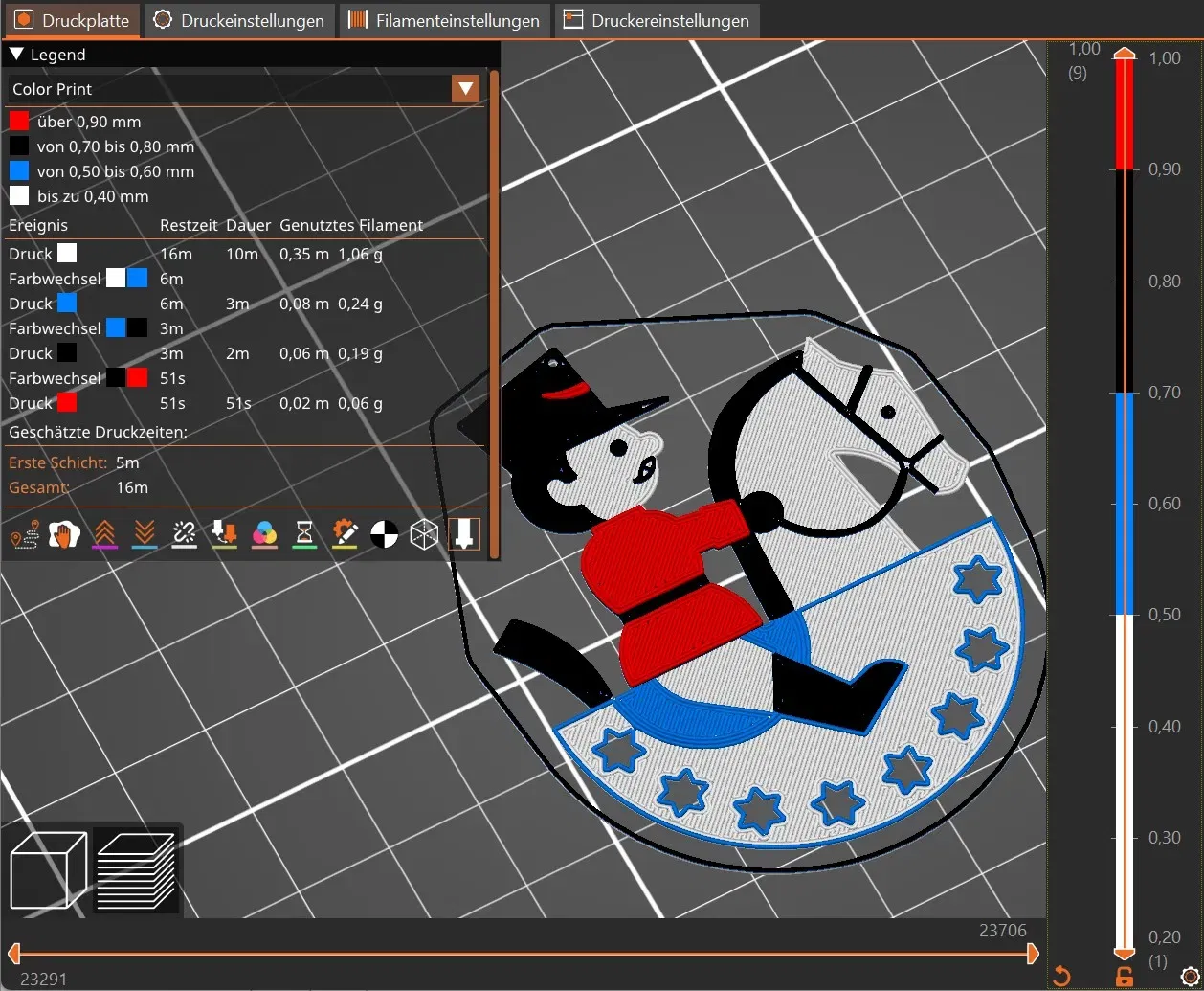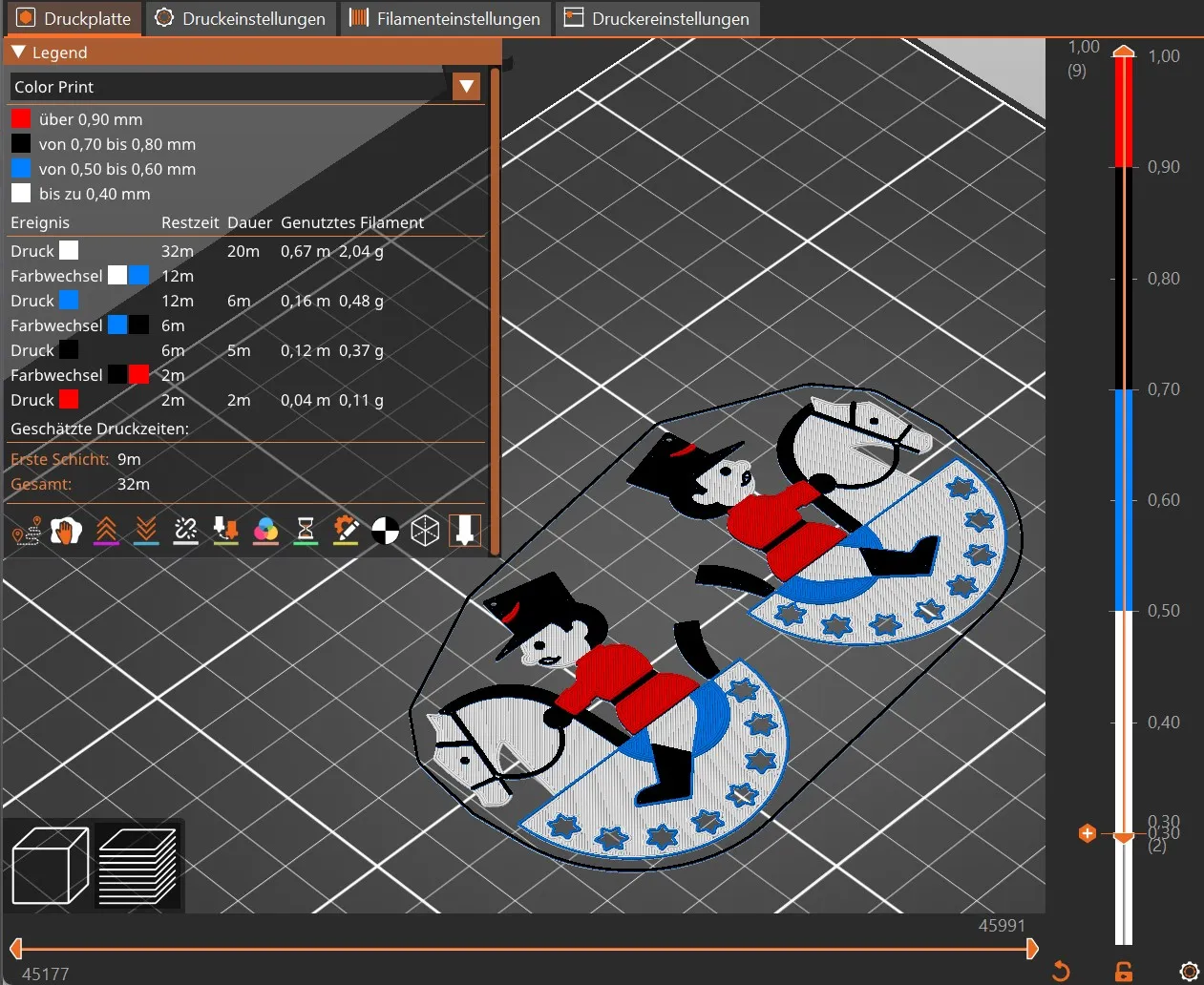 Es sind 3 .gcode Dateien vorhanden, 1x das Reiterlein (Druckzeit 16 min), 1x Reiterlein gespiegelt (Druckzeit 16 min) und 1x Reiterlein + Reiterlein_gespiegelt (Druckzeit 32 min).