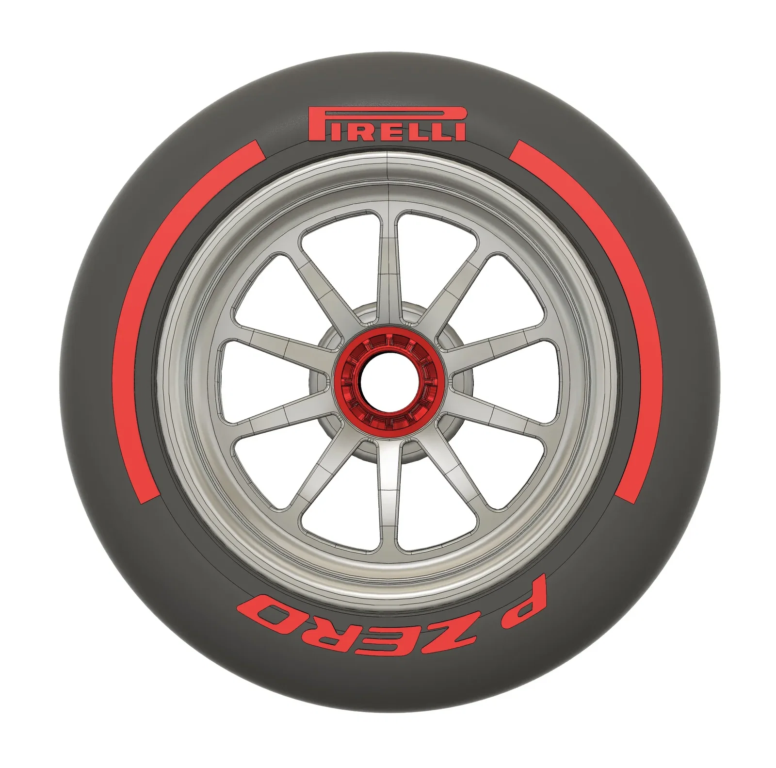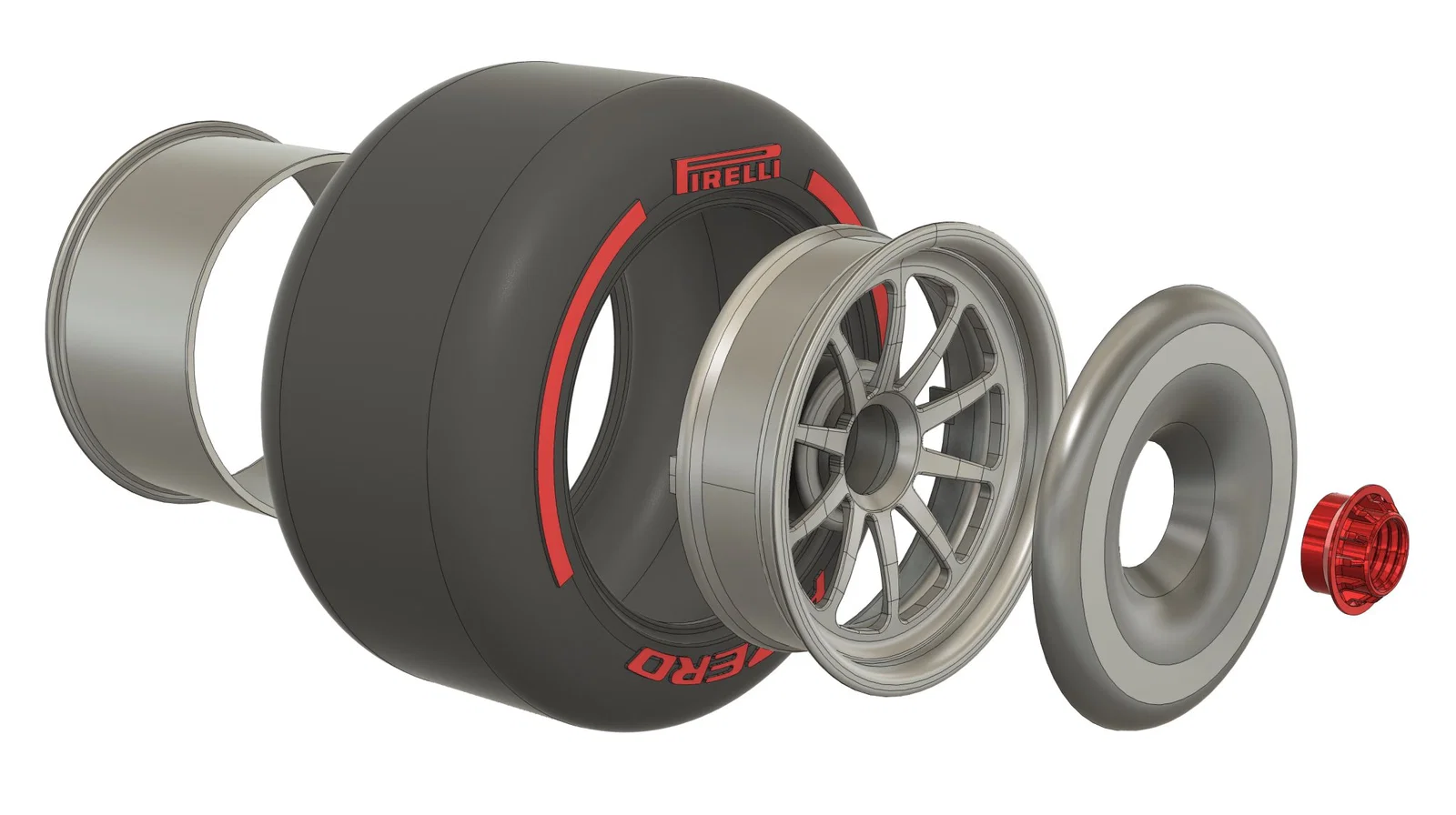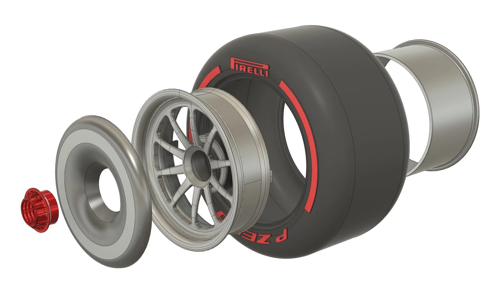 Lốp F1 2022 gồm 5 bộ phận: mâm trước, mâm sau, lốp, ốp bánh xe và đai ốc. Mâm được chia làm 2 phần để có thể lồng lốp vào giữa. Mọi thứ đều có thể tùy chỉnh kích thước theo ý muốn khi in.